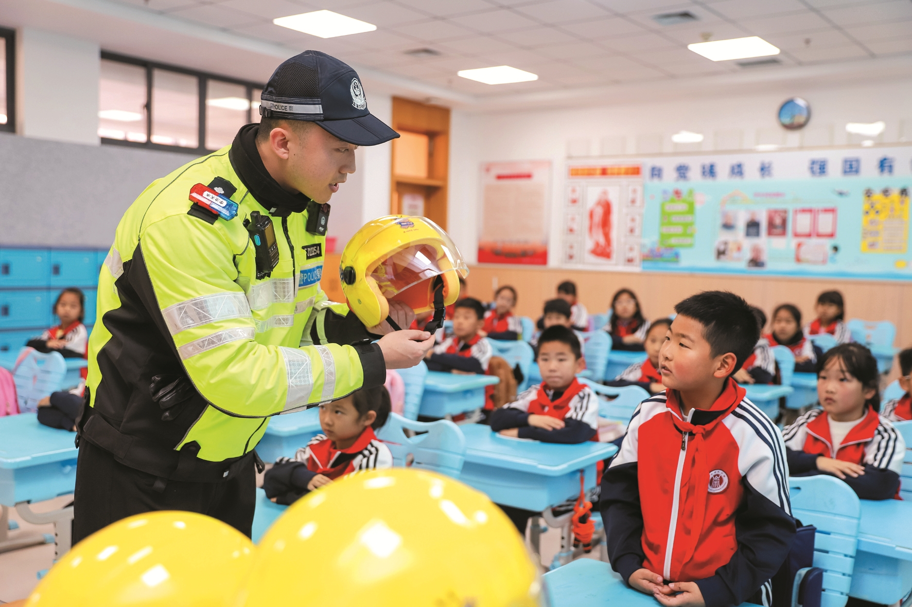 图为12月1日,山东省青岛市公安局交通管理支队李沧区大队辅警在青岛崇礼小学指导学生正确佩戴安全头盔。(新华社发)