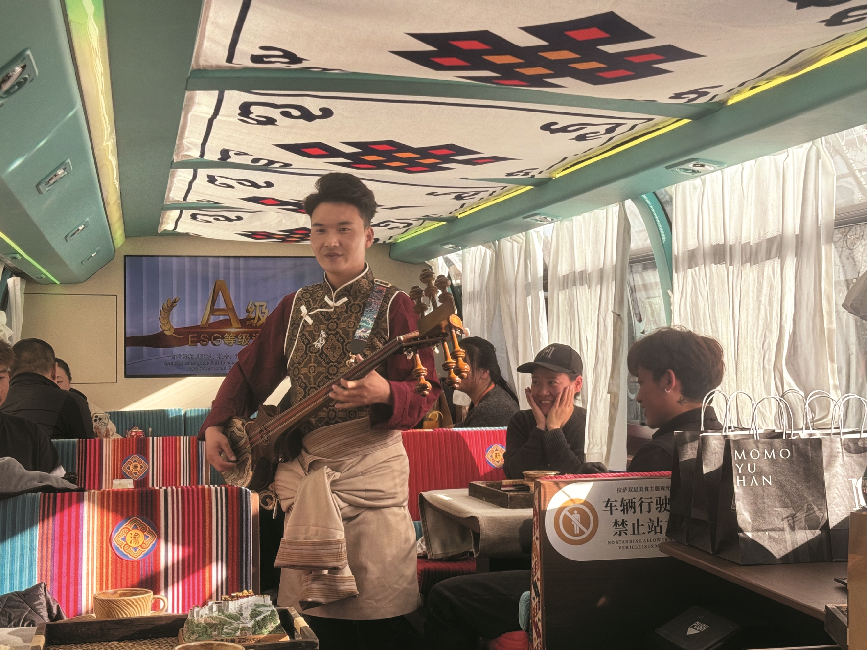 ?图为拉萨双层美食主题观光巴士。 ▲图为双层美食主题观光巴士内演员精彩的表演。 拉萨融媒记者 满文妍摄