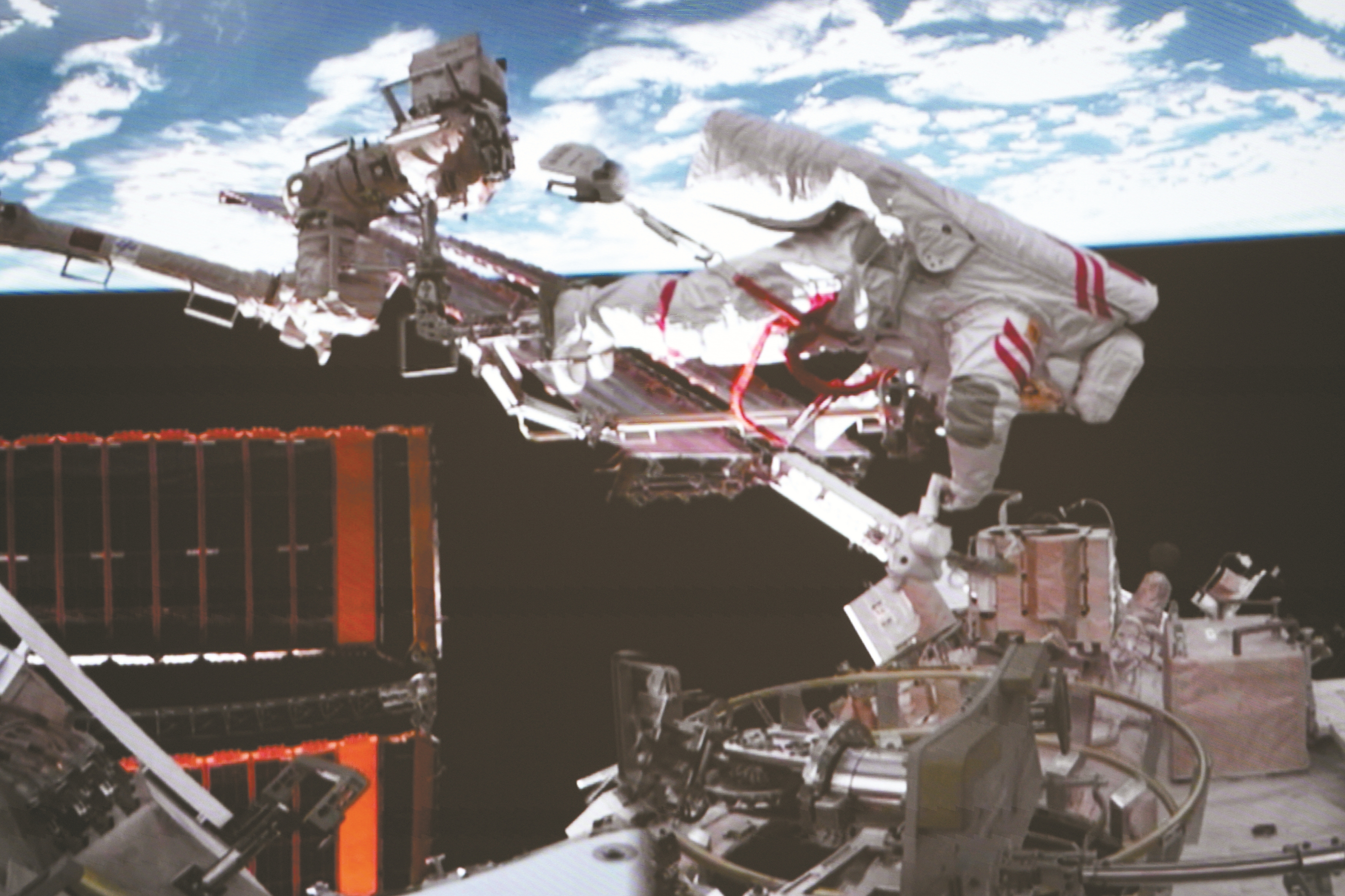 这是12月9日在北京航天飞行控制中心屏幕上拍摄的神舟二十一号乘组航天员张陆在舱外工作的画面。 新华社记者 刘 艺摄
