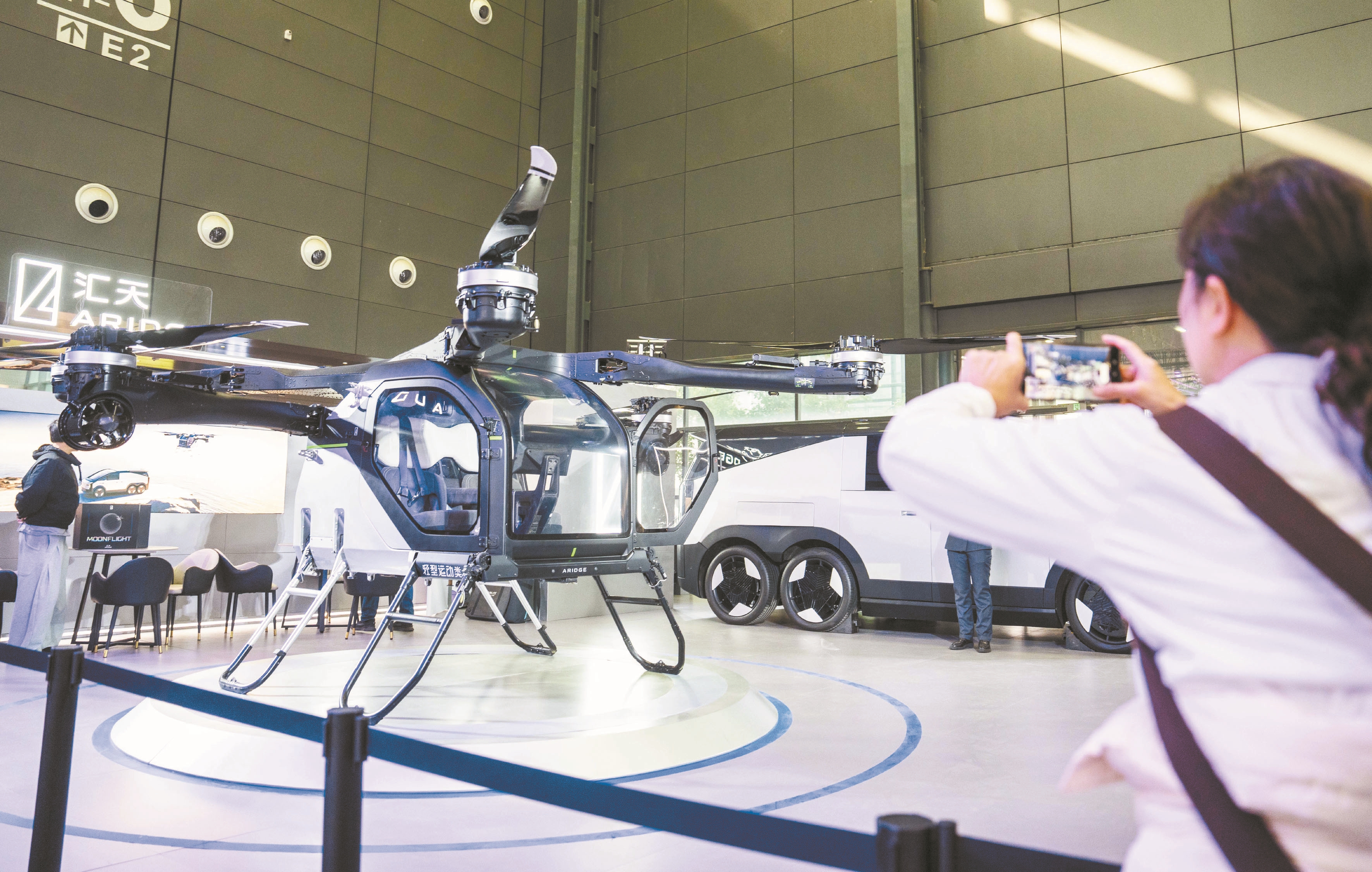 这是12月10日,观众在拍摄参展的飞行汽车飞行体。