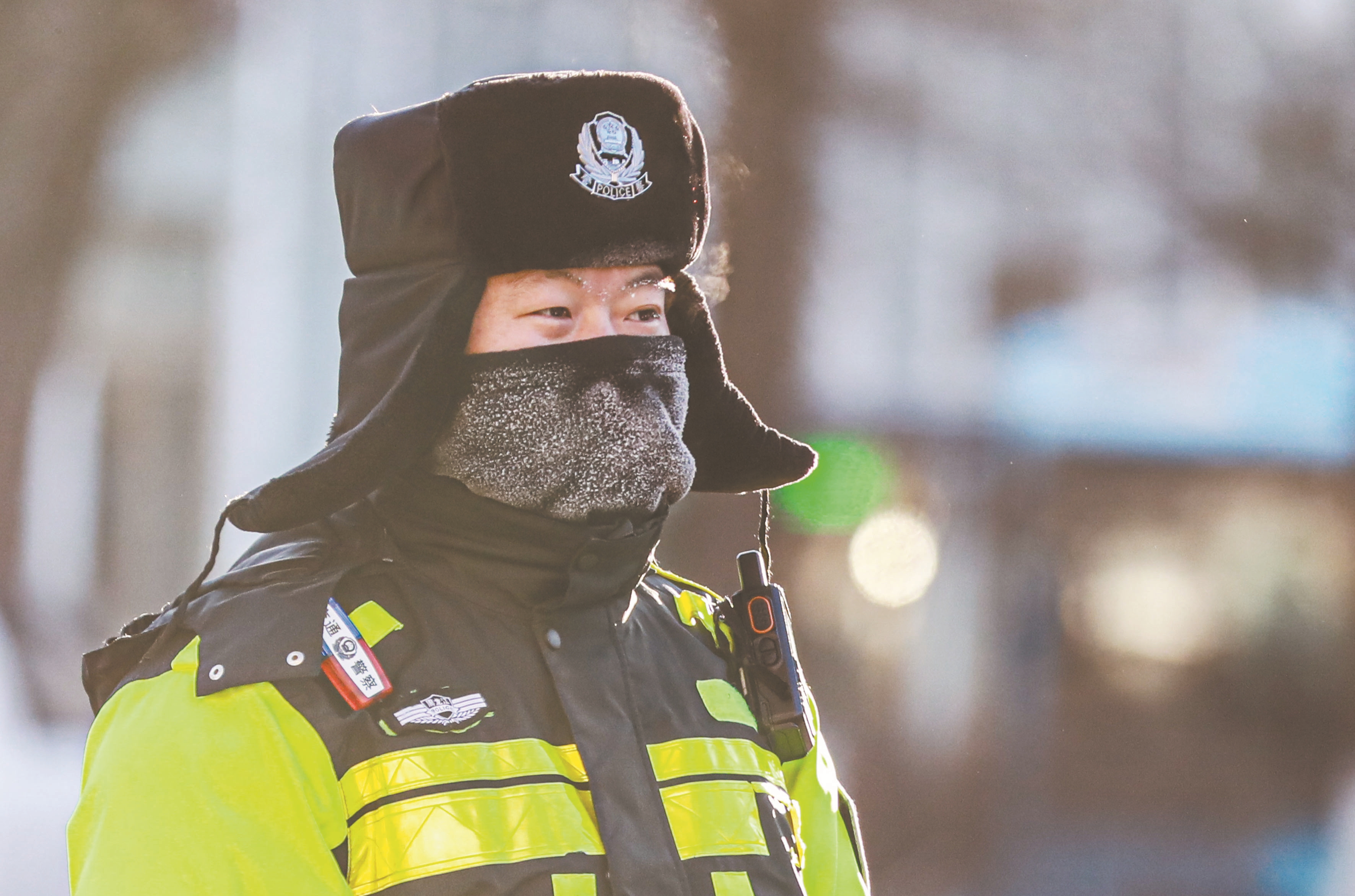 ▲图为12月10日,河南省南阳市新野县城郊乡吕庄村,村民在蔬菜种植基地对蔬菜大棚进行封土加固。 ▼图为12月11日,在黑龙江省伊春市伊美区,一名交警在寒潮中指挥交通。 (新华社发)