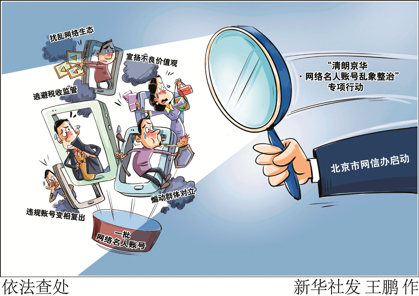 记者从北京市网信办获悉,为进一步规范网络名人账号信息传播秩序,近期北京市网信办启动“清朗京华·网络名人账号乱象整治”专项行动,指导网站平台重点整治煽动群体对立、宣扬不良价值观、扰乱网络生态、违规账号变相复出、逃避税收监管等突出问题,发现并查处了一批网络名人账号。 (新华社发)