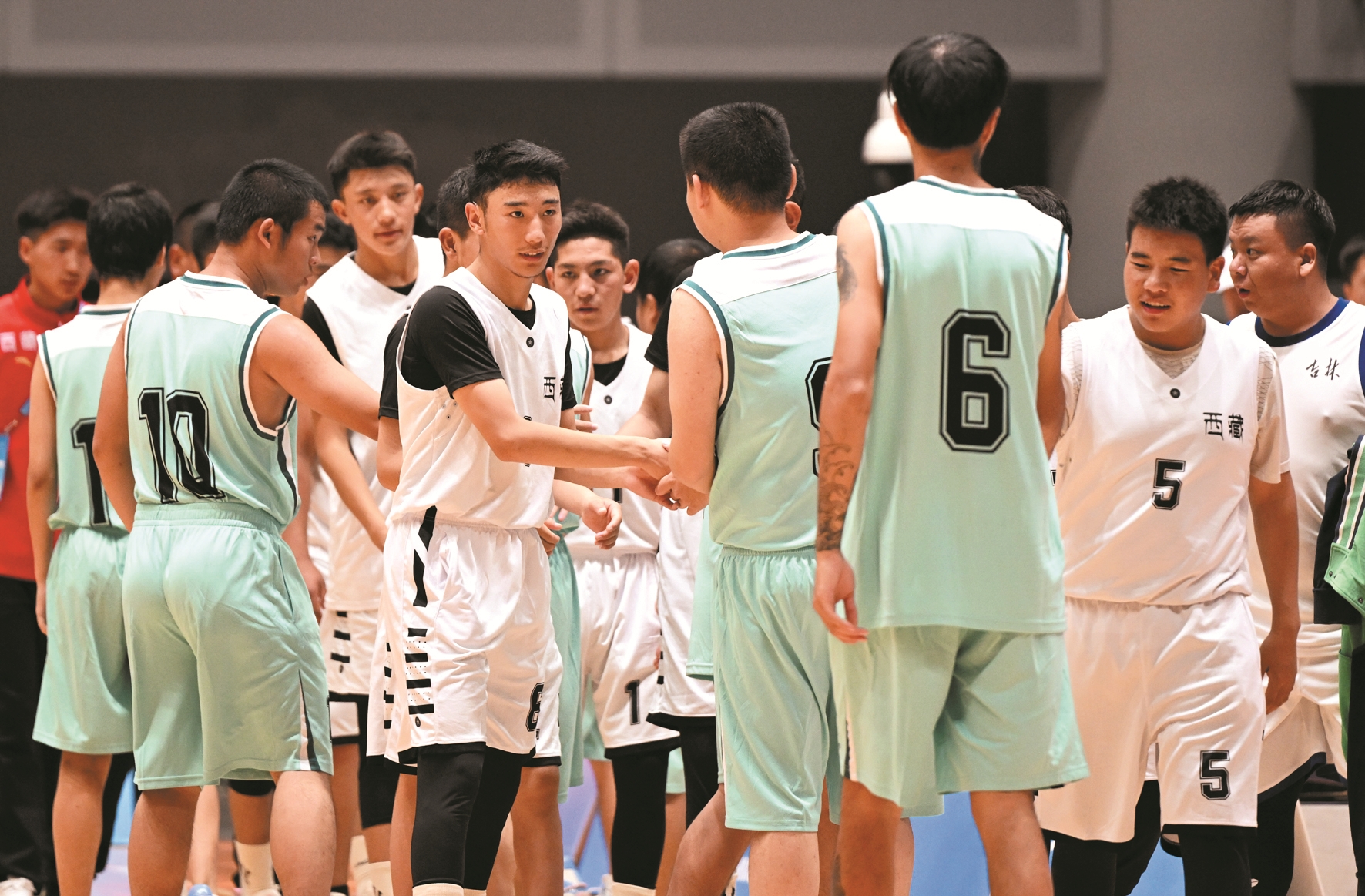 12月13日,全国第十二届残疾人运动会暨第九届特殊奥林匹克运动会特奥篮球项目队制决赛在广东省江门市举行。 ▲图为当日,西藏队和福建队球员在男子组决赛B组赛后握手致意。最终,西藏队44比23战胜福建队。 新华社记者 邓 华摄