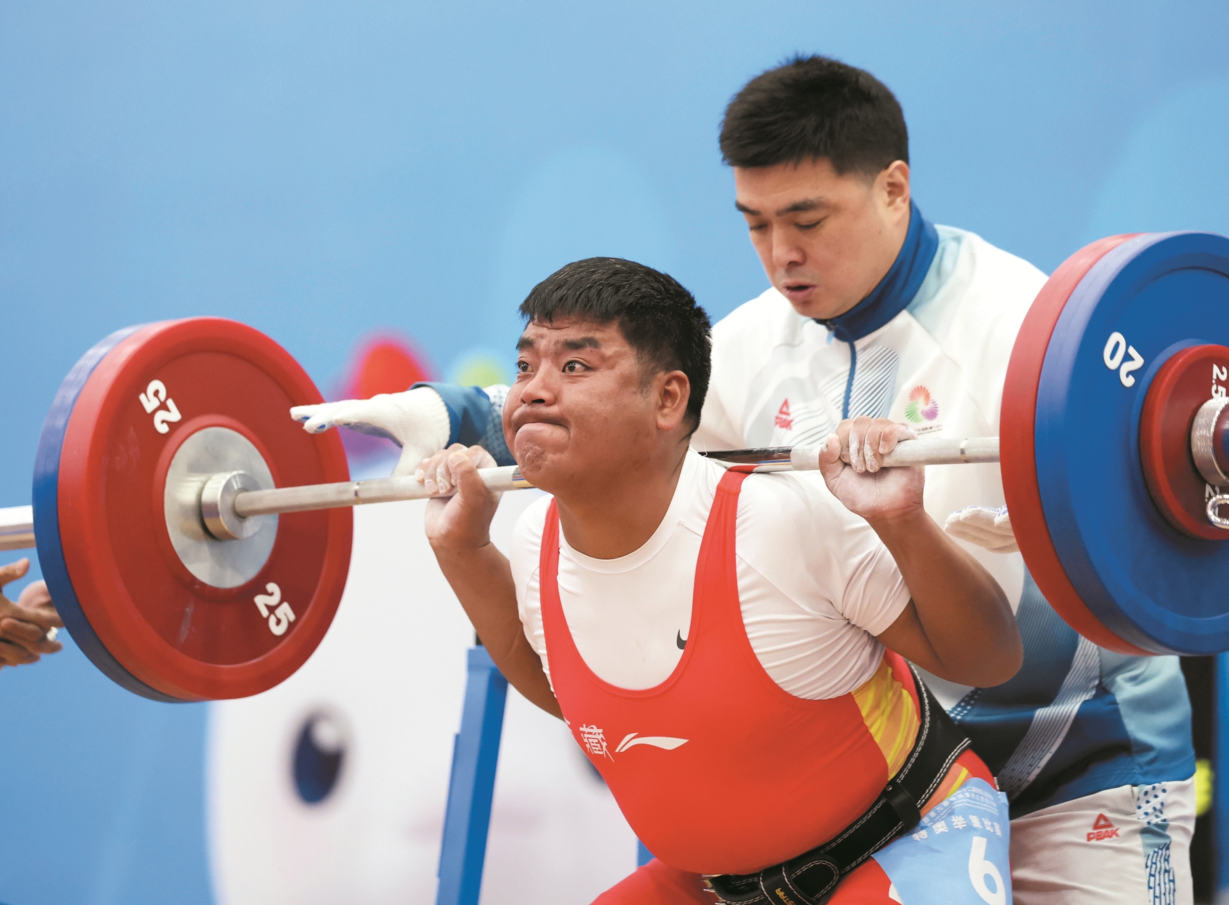 12月14日,全国第十二届残疾人运动会暨第九届特殊奥林匹克运动会特奥举重决赛在广东省中山市举行。 ▲图为当日,西藏队选手洛桑次仁在男子22岁以上组90公斤深蹲决赛中。他获得该级别亚军。 新华社记者 戴翘楚摄