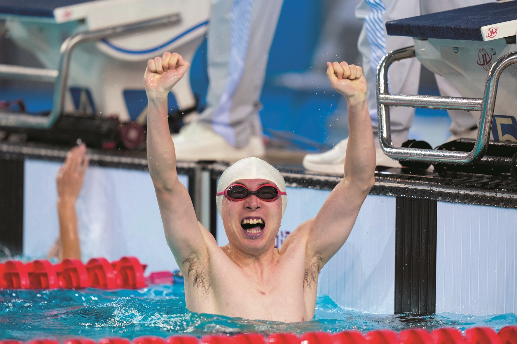 图为12月14日,孙宇亮在男子22-29岁组4X50米自由泳接力第1组决赛后庆祝夺冠。