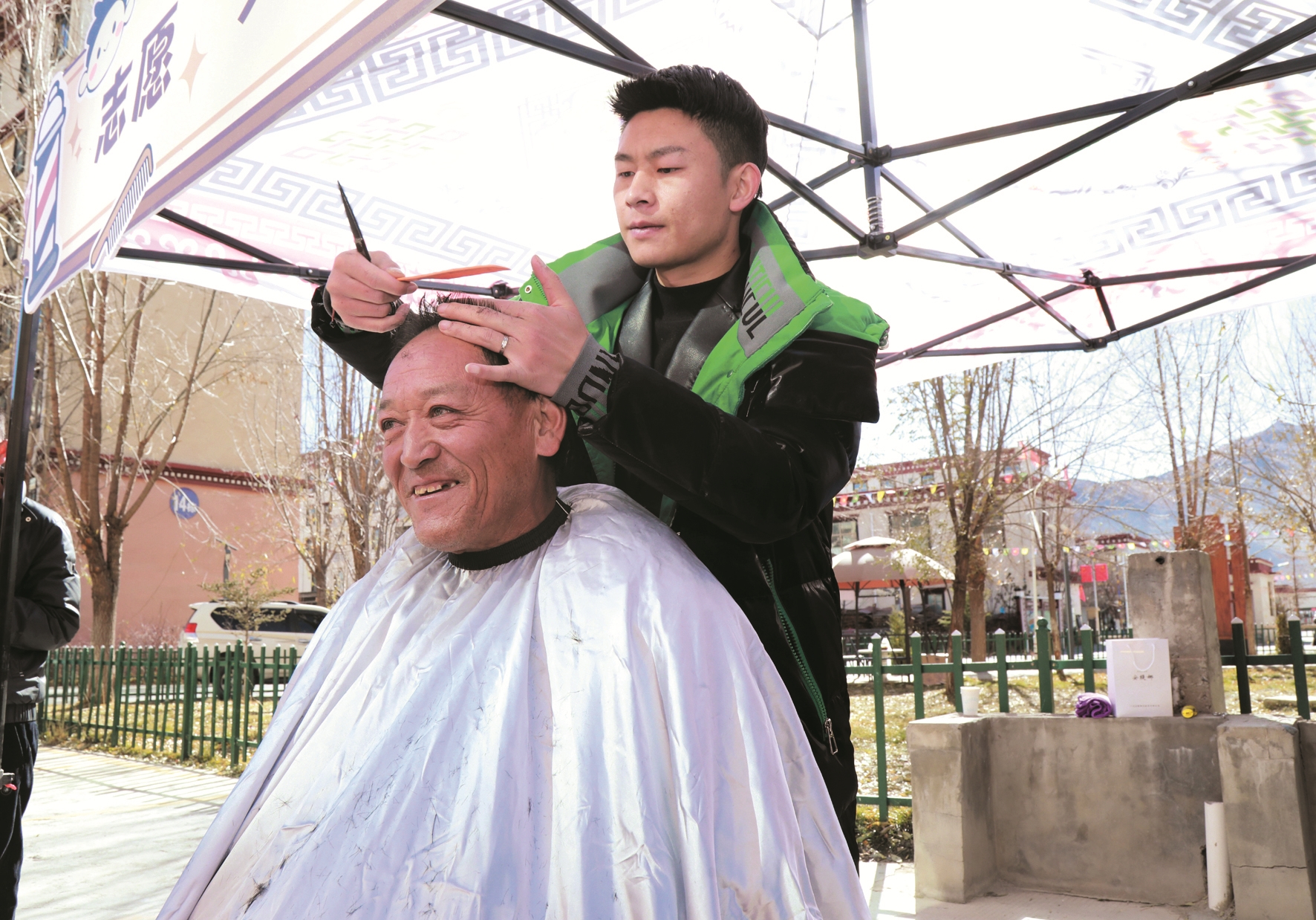 图为活动现场,志愿者为老人免费理发。拉萨融媒记者 莫瑞英摄