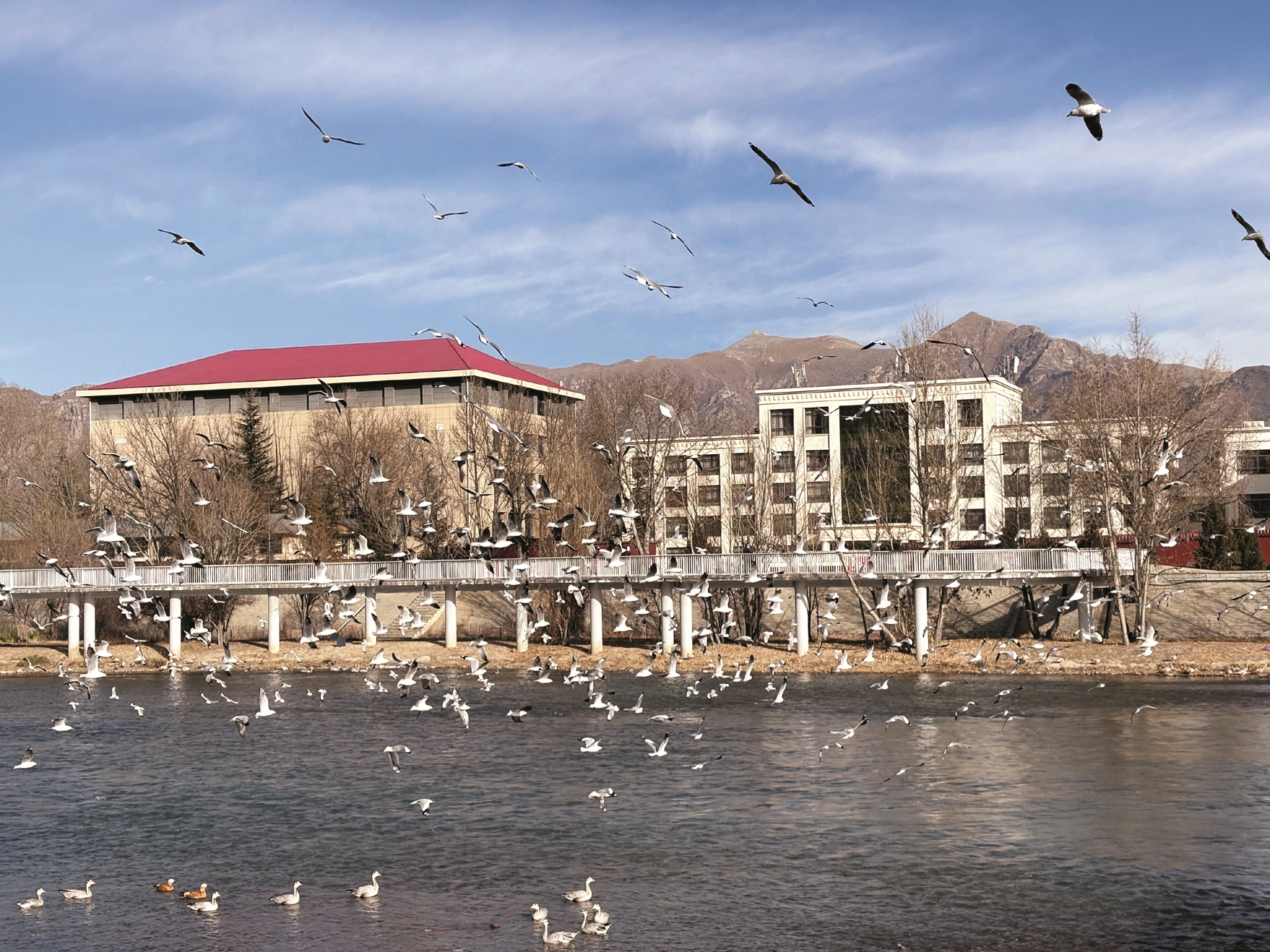 近期,大批迁徙而来的候鸟悠然栖息在拉萨河上,成群的斑头雁或在湛蓝河面上空盘旋滑翔,或轻盈漂浮于水面,洁白羽翼与河水相映,勾勒出一幅绝美的自然人文和谐图景,为冬日拉萨注入勃勃生机,与远处城市景观共同构成一幅人与自然和谐共生的生态画卷。
