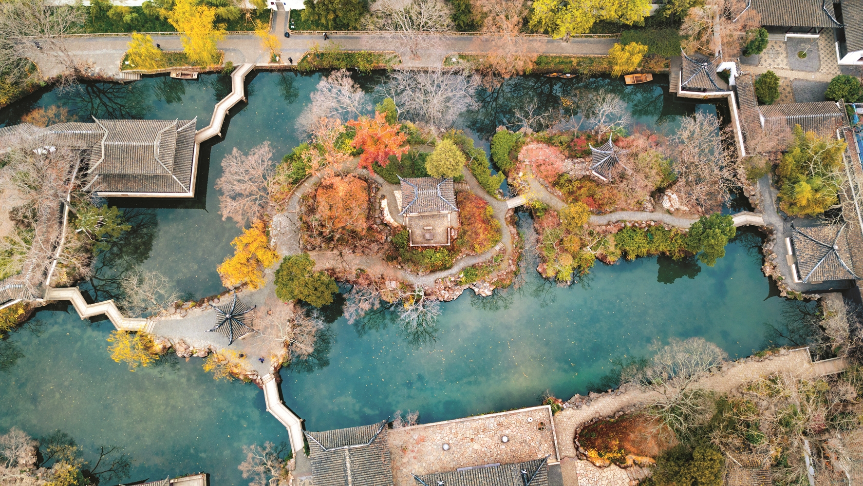↑图为12月16日拍摄的江苏苏州拙政园冬景(无人机照片)。