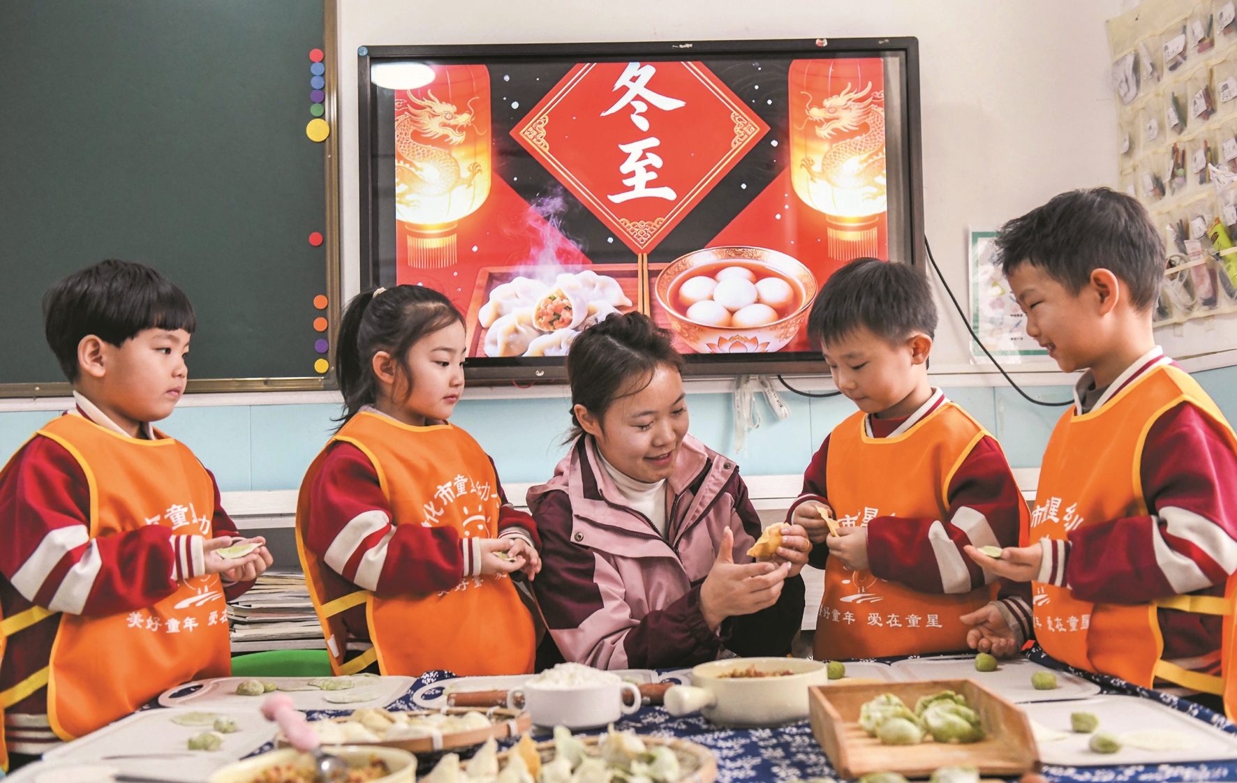 图为12月19日,河北省遵化市童星幼儿园的老师指导小朋友包饺子。