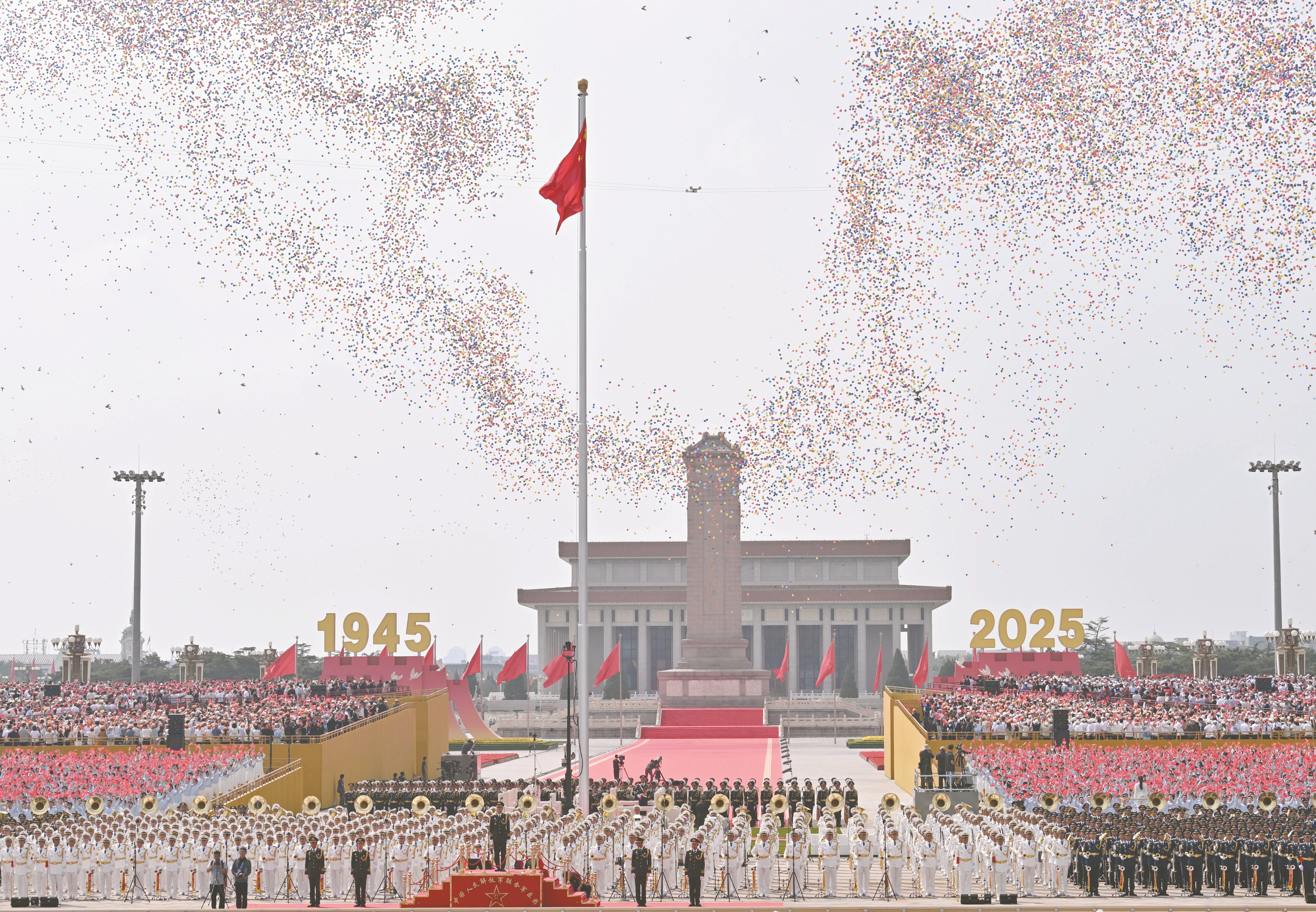 二〇二五年九月三日,纪念中国人民抗日战争暨世界反法西斯战争胜利80周年大会在北京隆重举行。这是纪念大会现场放飞气球。 新华社记者 李 贺摄