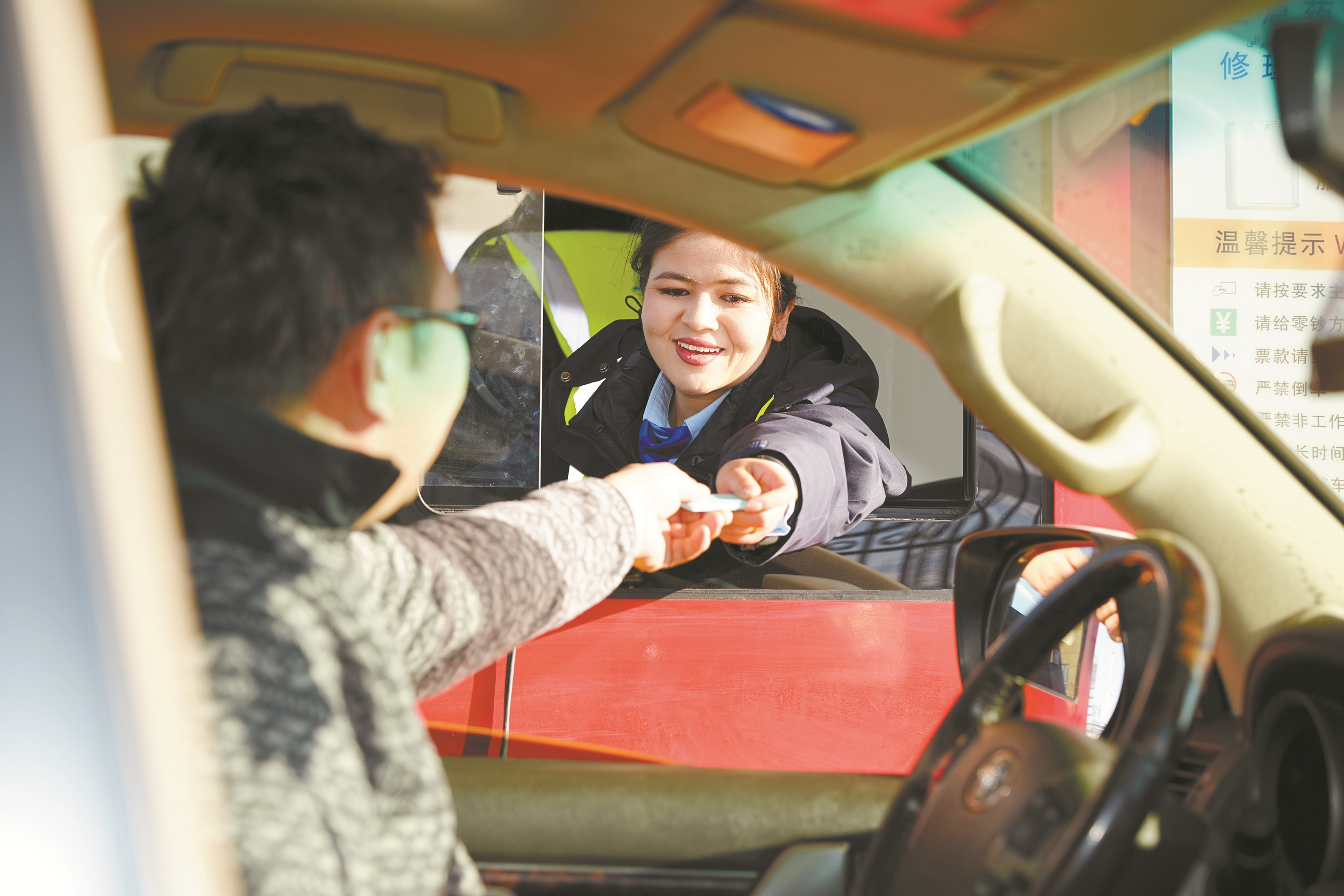 ?12月26日,在乌尉高速公路永丰收费站,工作人员向驾驶员发放通行卡。