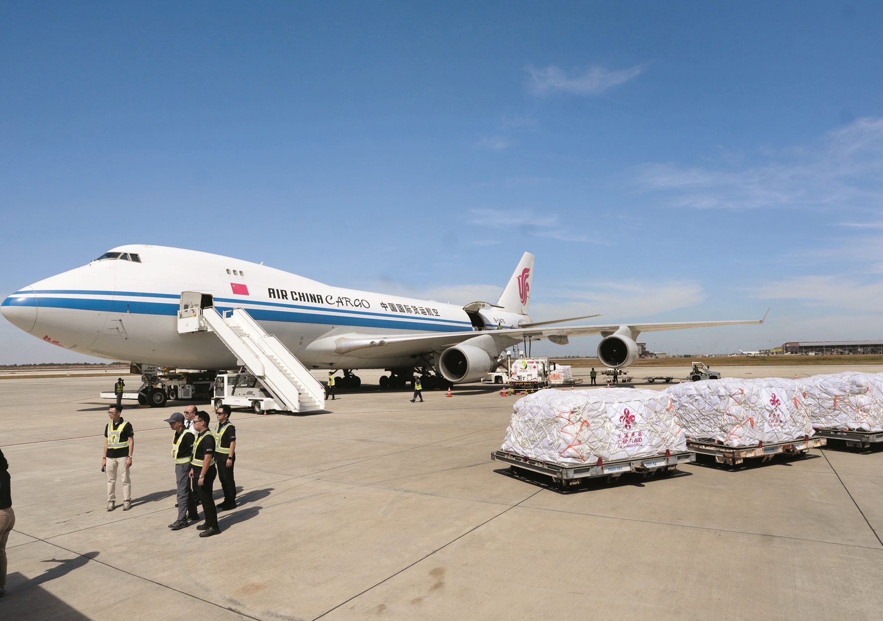 为12月28日,首批中国援柬埔寨紧急人道主义物资运抵柬埔寨金边德崇国际机场。 (新华社发)