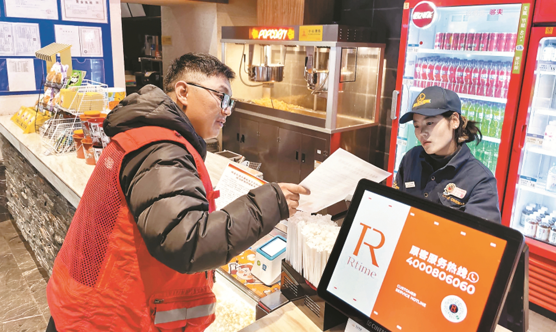 图为工作人员向商户讲解“门前三包”责任相关内容。