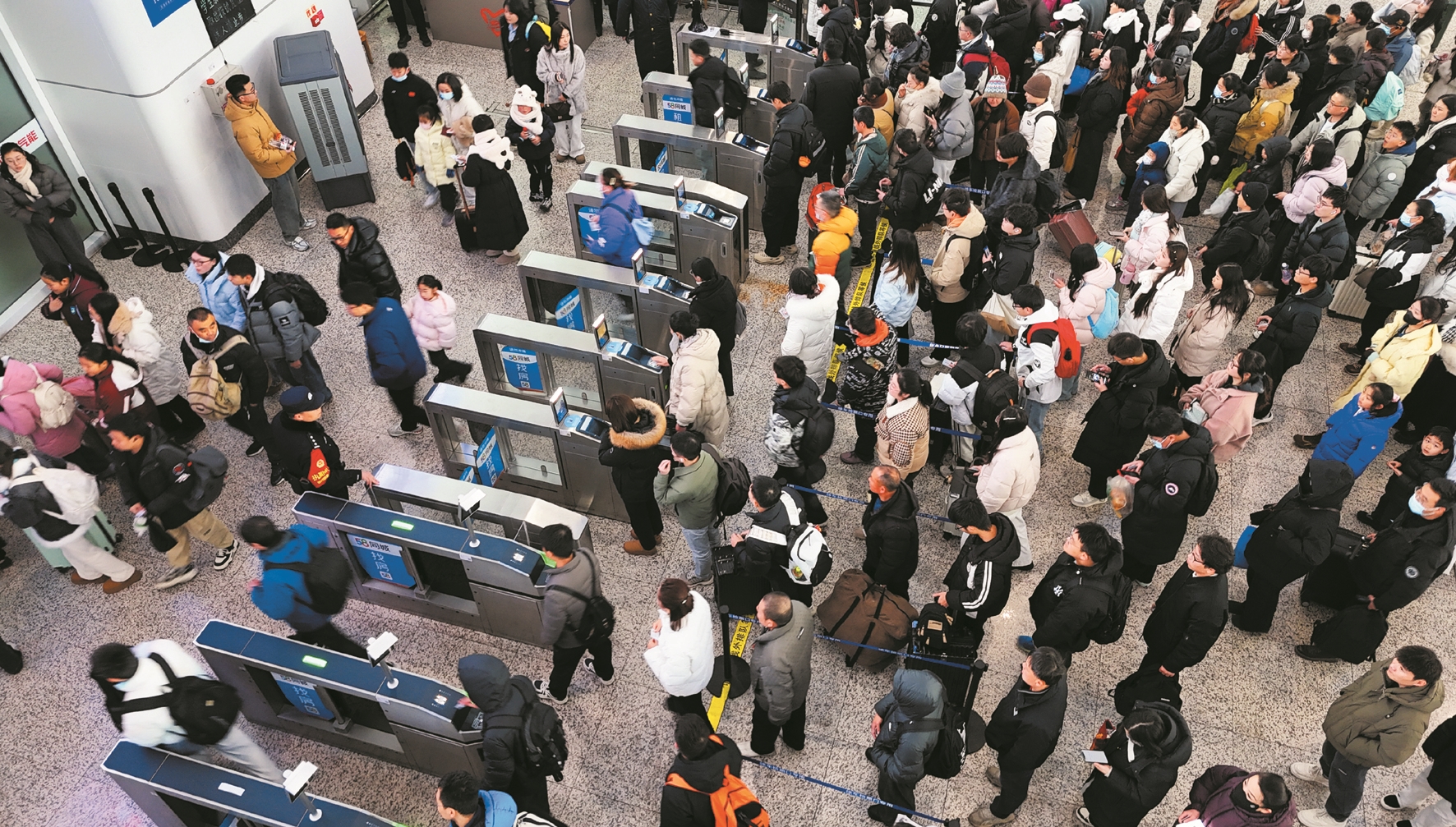 ▼这是2026年1月1日,在铁路连云港站,旅客通过检票闸机(无人机照片)。 (新华社发)