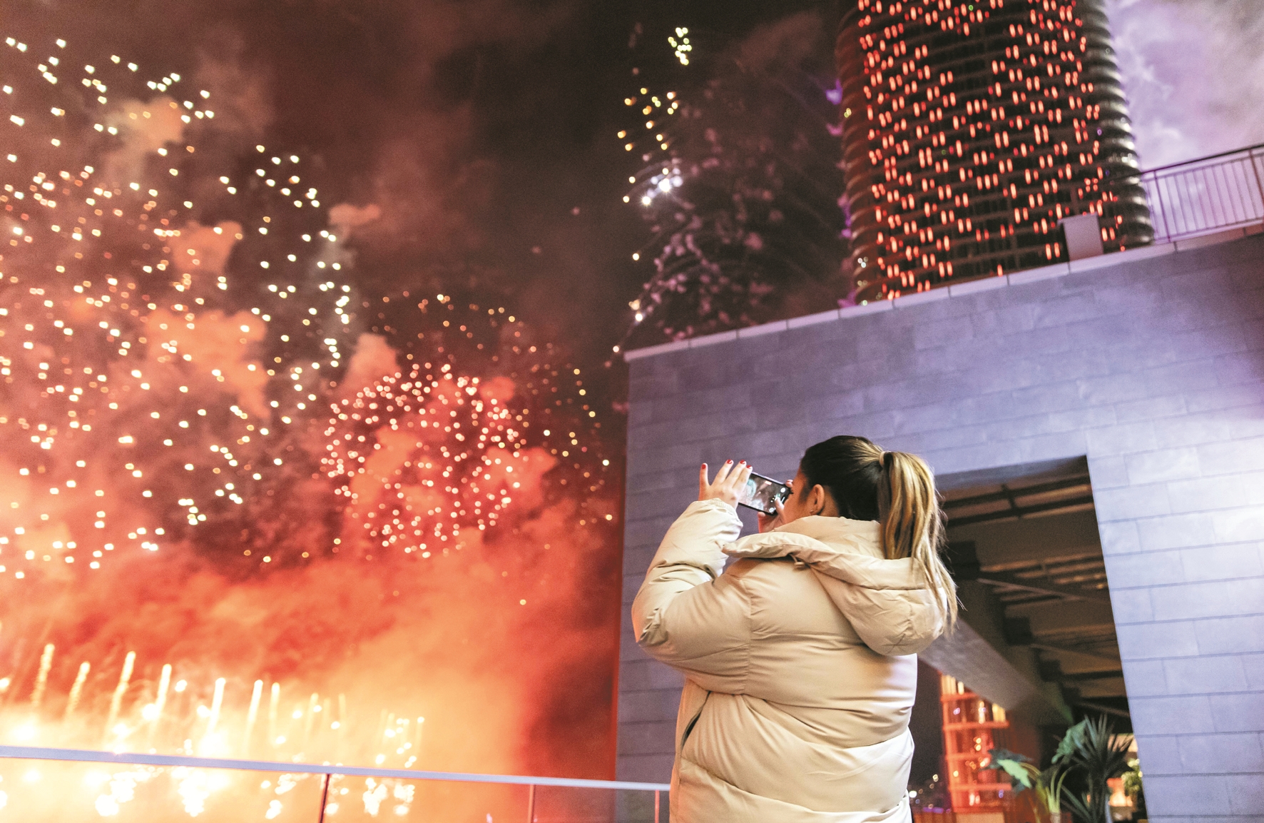 ▲图为2026年1月1日,在塞尔维亚首都贝尔格莱德,一名女子用手机拍摄迎新年烟花秀。 (新华社发)
