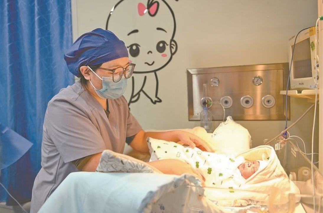 右图:1月1日,自治区人民医院妇产科助产医生次拉在包裹新生儿。
