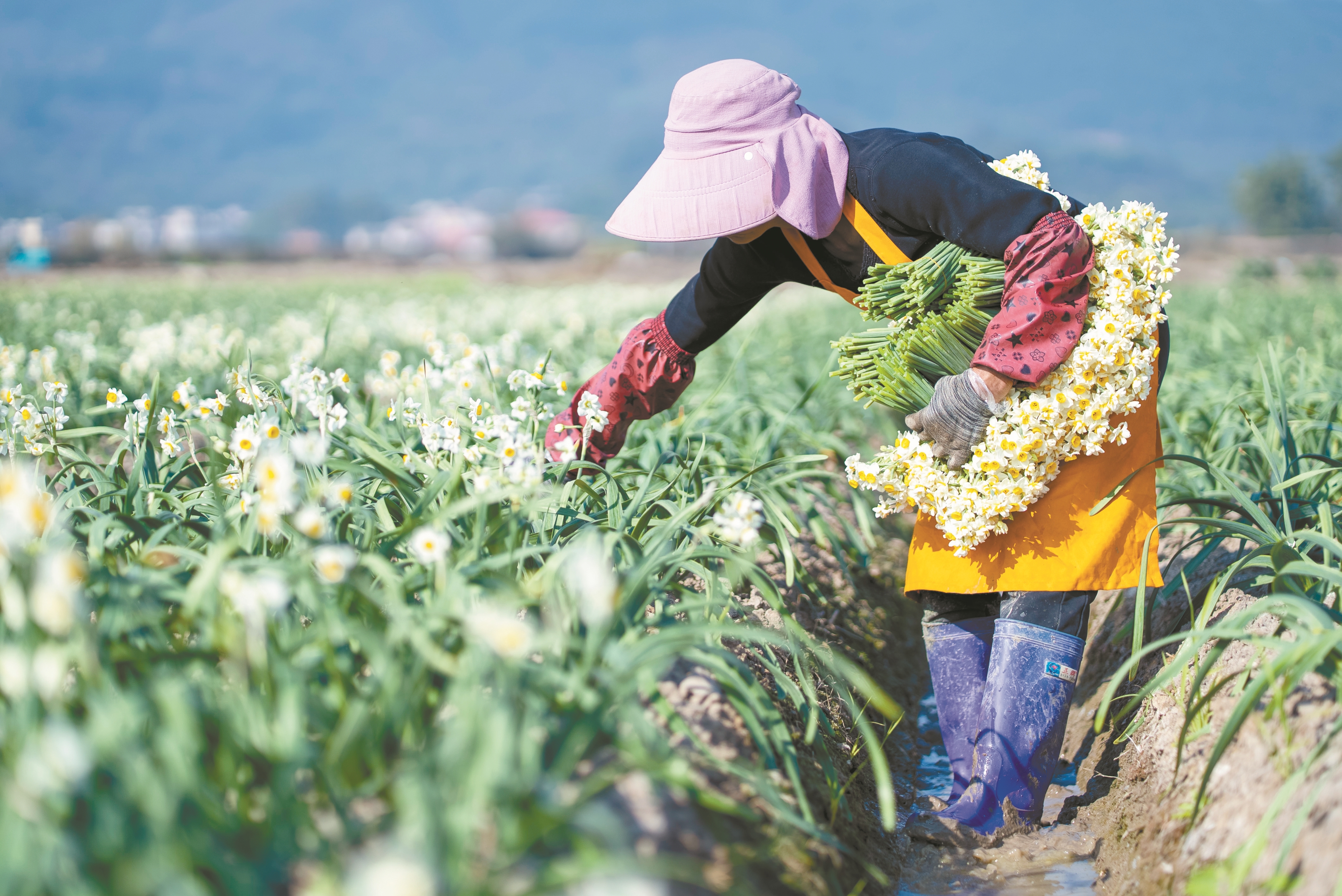 ▲图为1月5日,福建省漳州高新区九湖镇大梅溪村村民在田间采摘水仙花枝。