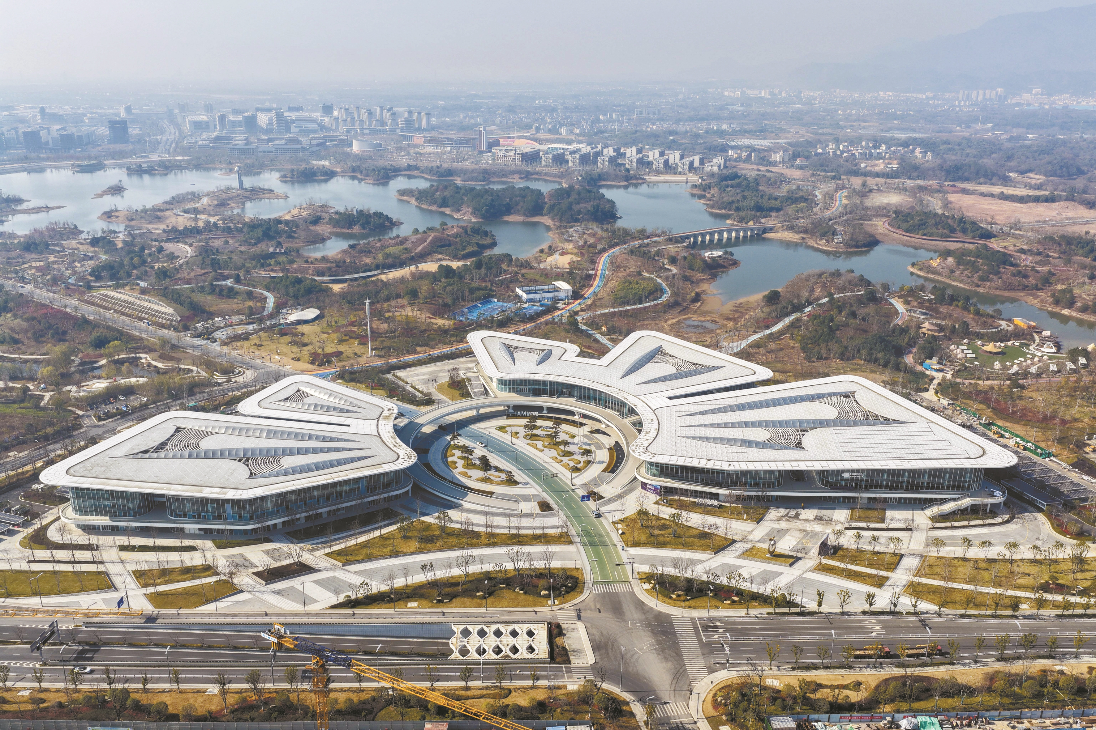 ▲这是空中俯瞰金华市金东区金漪湖云蝶中心(1月8日摄,无人机照片)。