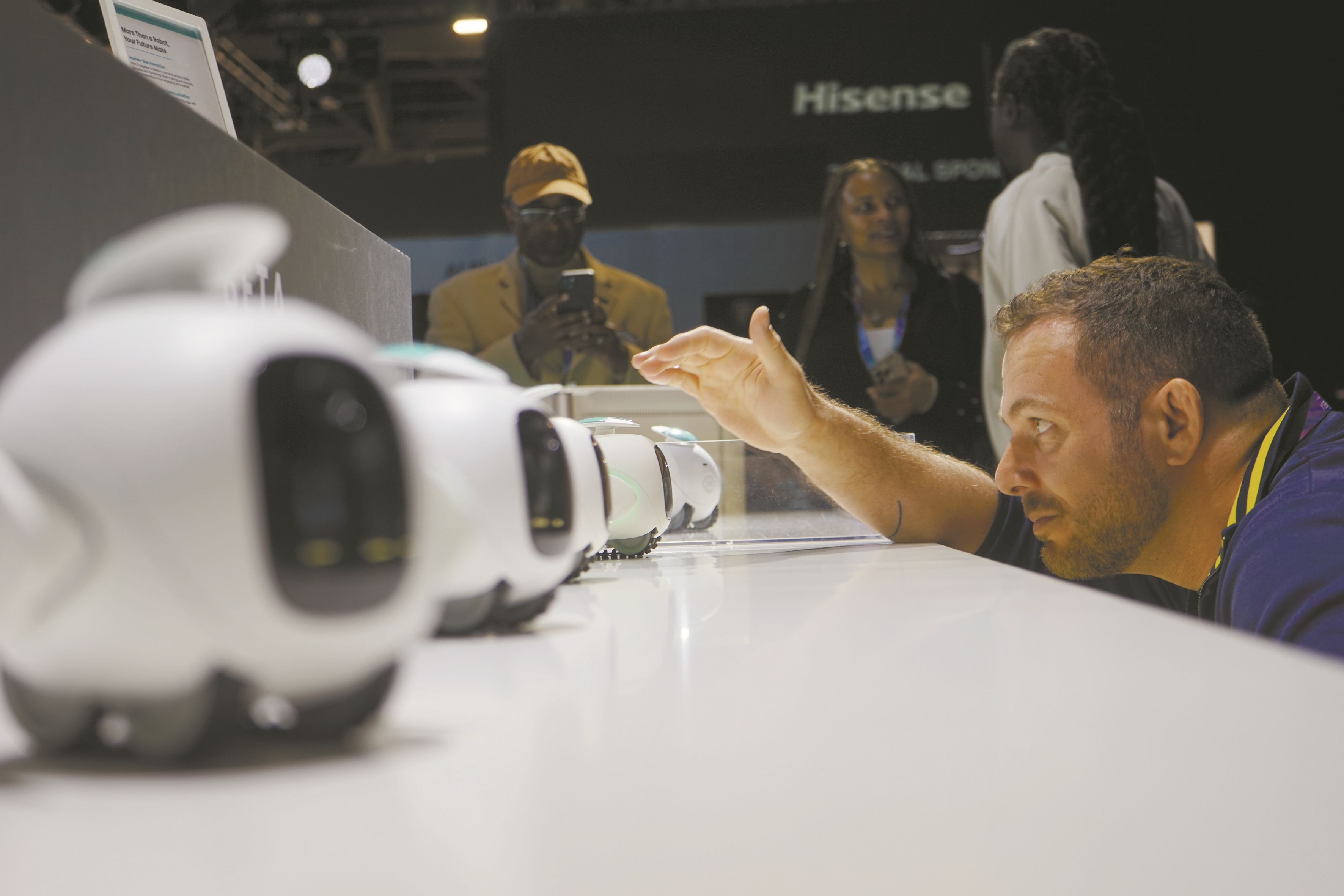 图?为一名男子在2026年美国拉斯维加斯消费电子展(CES)海信展台观看搭载新一代AI智能识别引擎的陪伴机器人Beta。