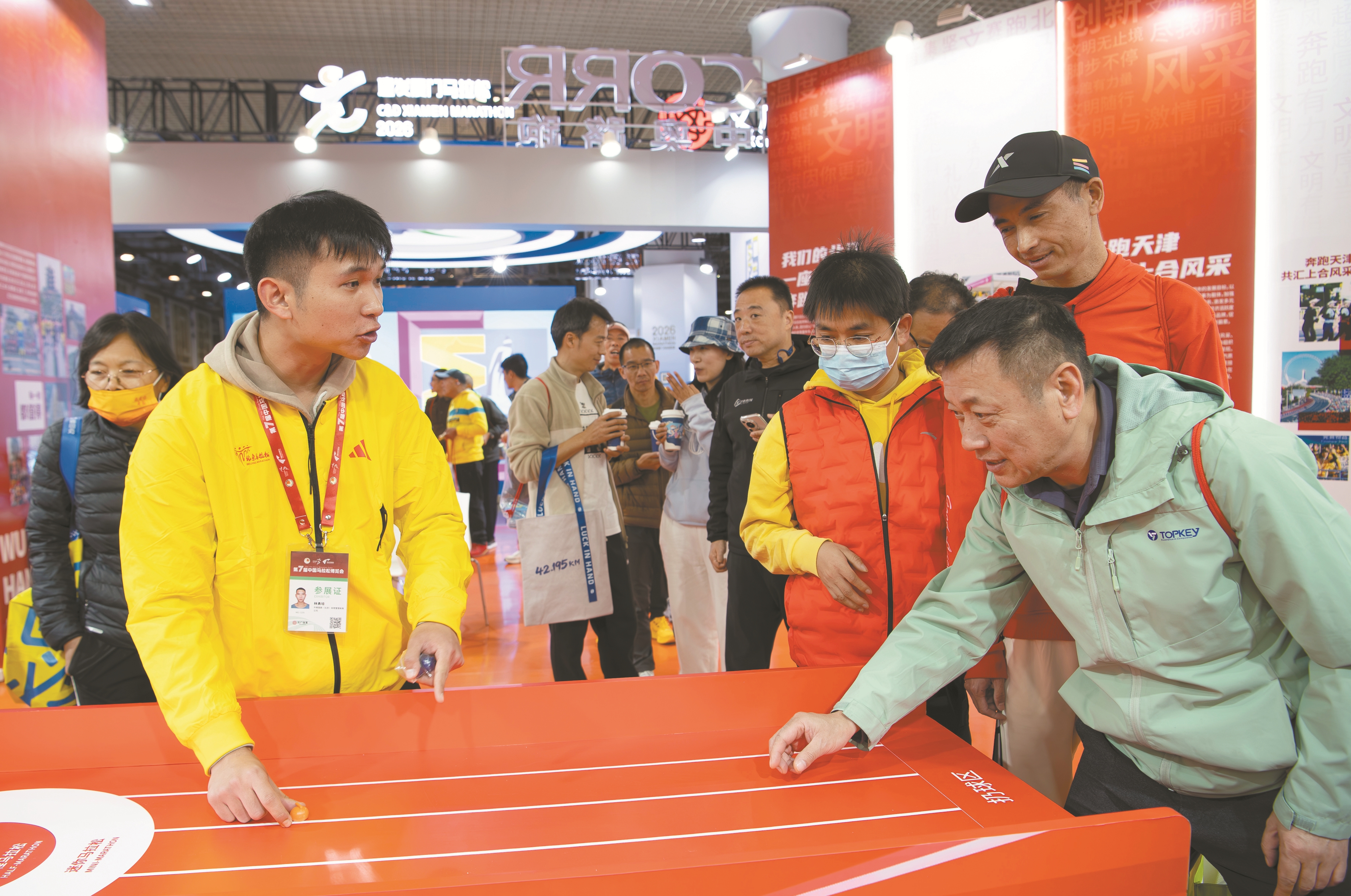 图?为厦门马拉松赛选手在博览会现场参加互动游戏。