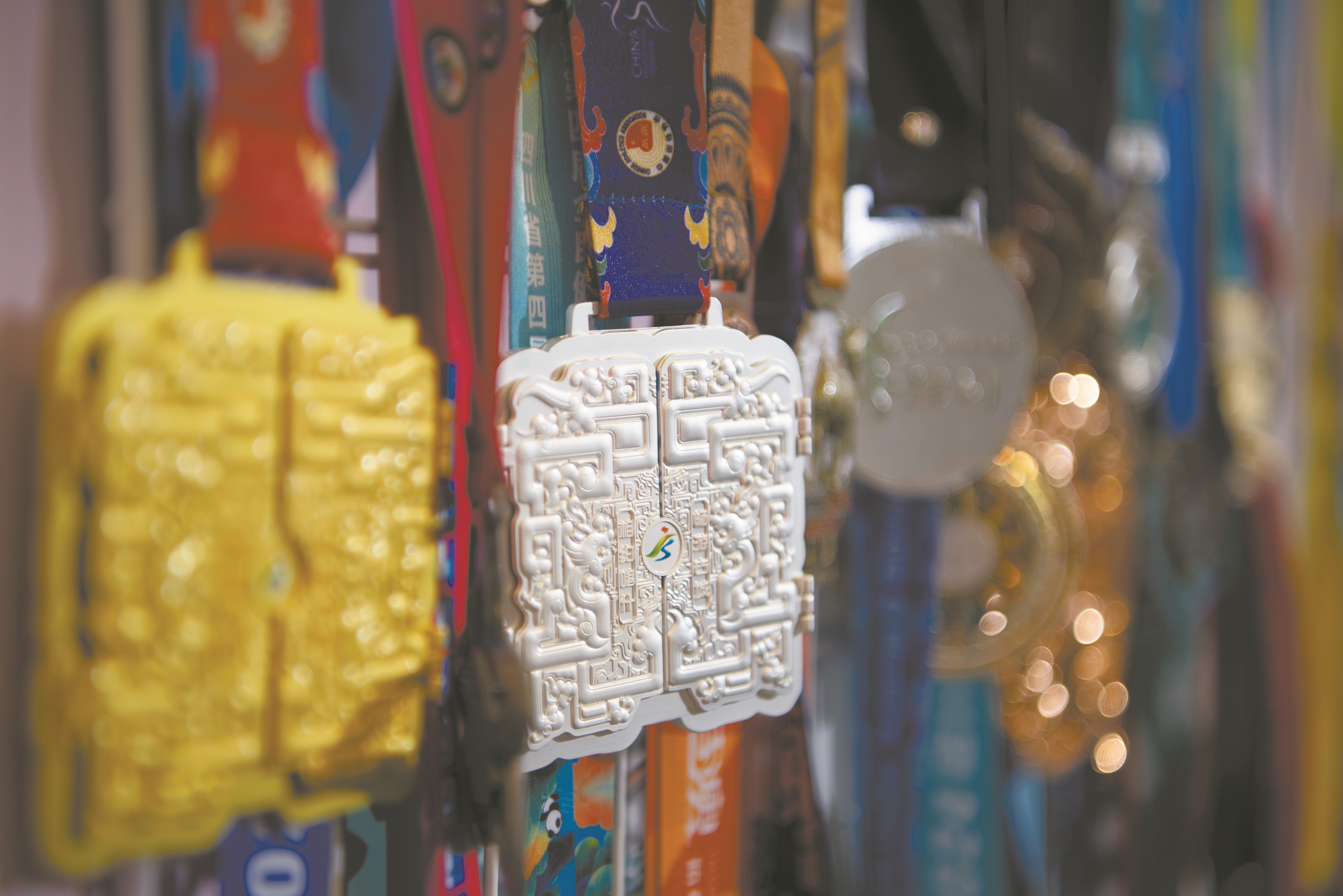 图?为一家奖牌生产企业在博览会上展示各种马拉松赛事奖牌。