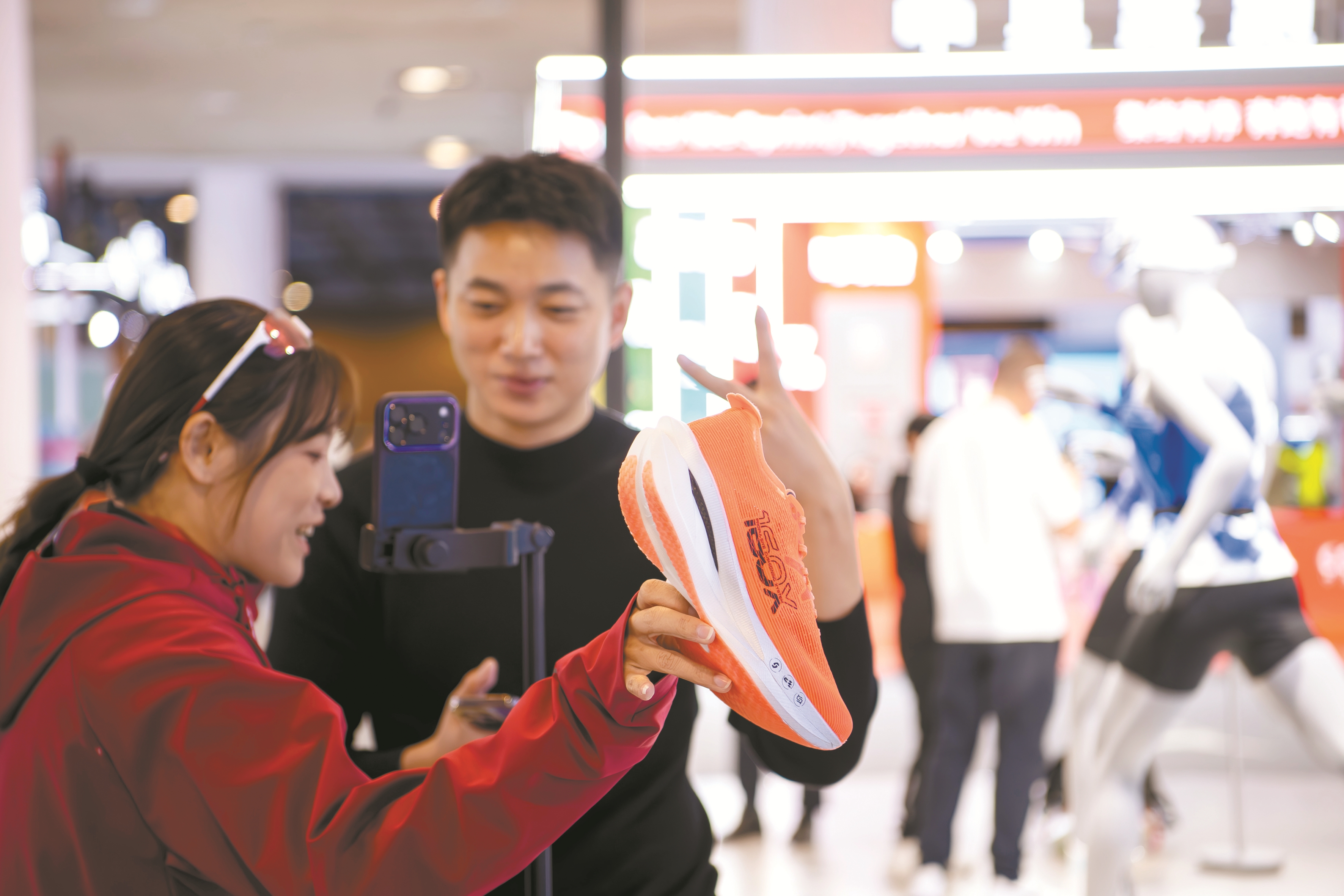 图?为两名体育用品企业工作人员在博览会现场利用电商平台直播推销运动鞋。