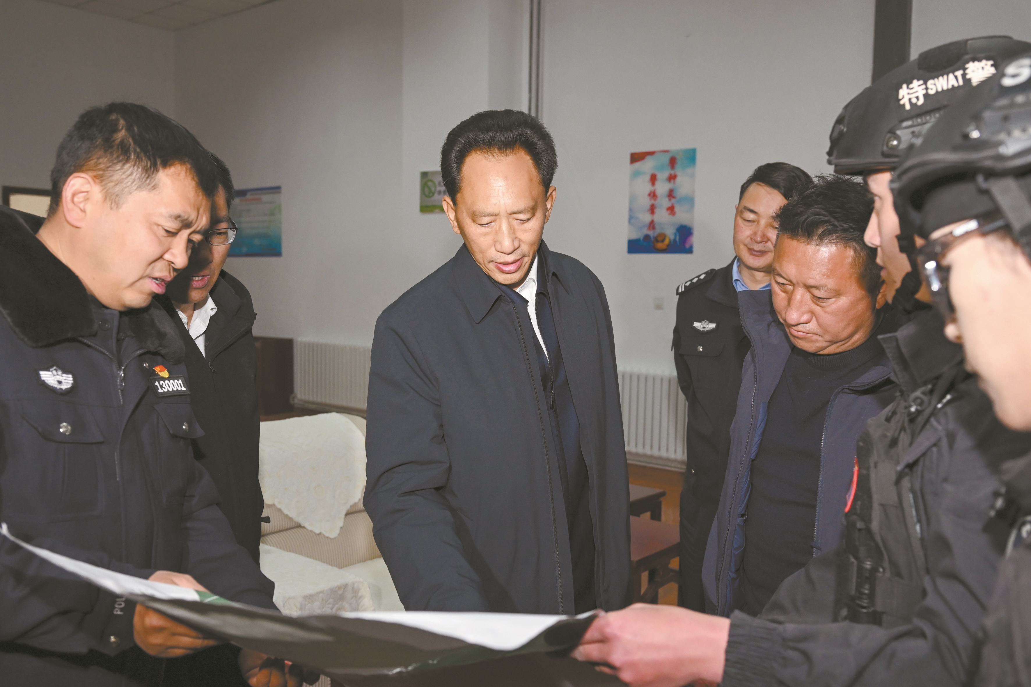1月9日上午,在第六个中国人民警察节来临之际,自治区党委常委、拉萨市委书记肖友才在市公安局特警支队慰问调研。这是肖友才详细了解支队装备建设、日常训练、队伍管理等情况。拉萨融媒记者 玉珠多杰摄