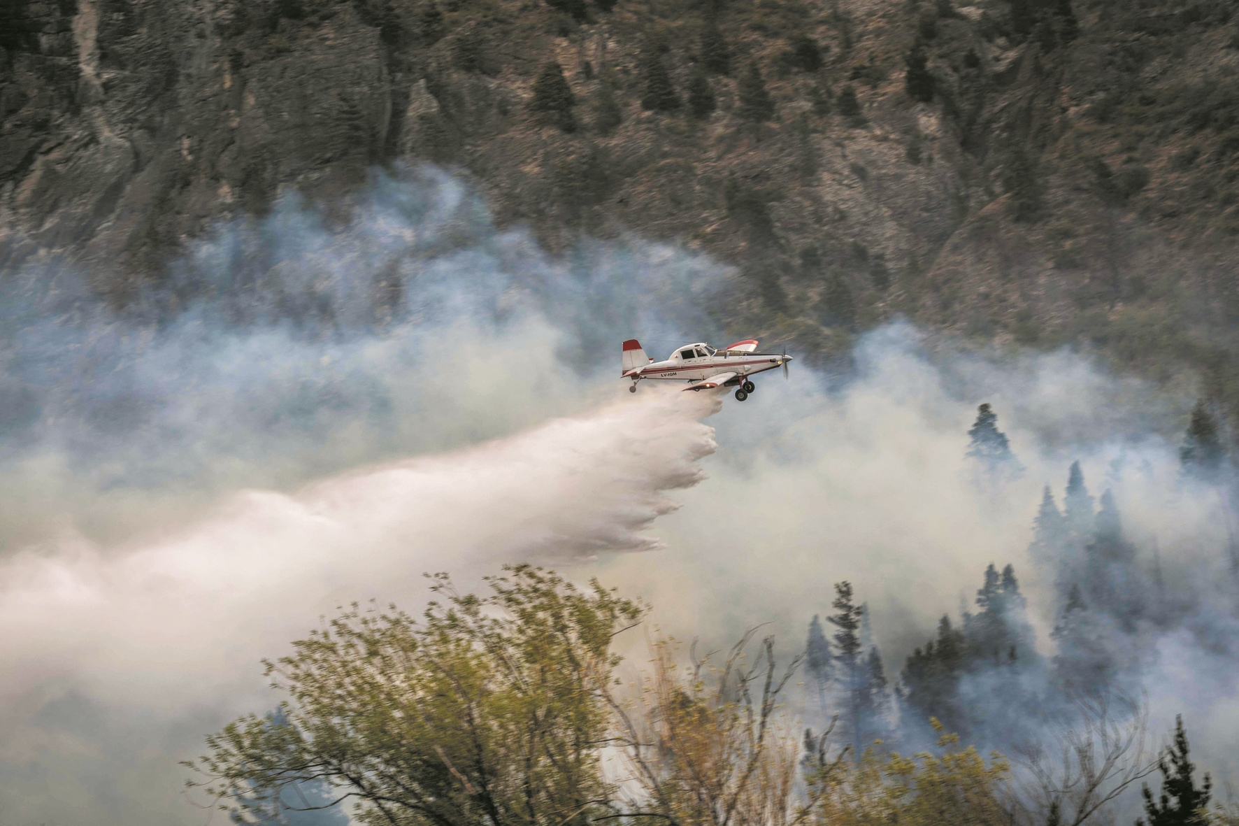▼图为1月10日,在阿根廷南部丘布特省巴塔哥尼亚地区的埃尔奥约,飞机进行灭火作业。 (新华社发)