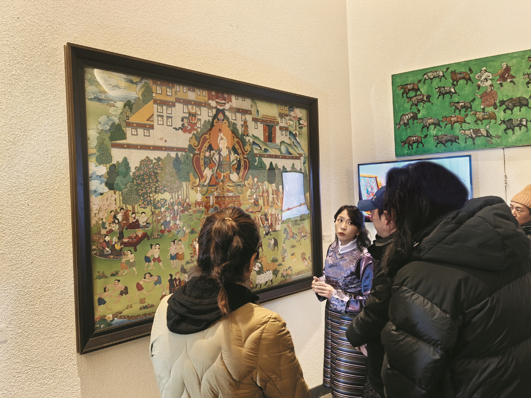图为观众参观2026年新展品《欢庆图》临摹唐卡。 拉萨融媒记者 次仁卓玛摄