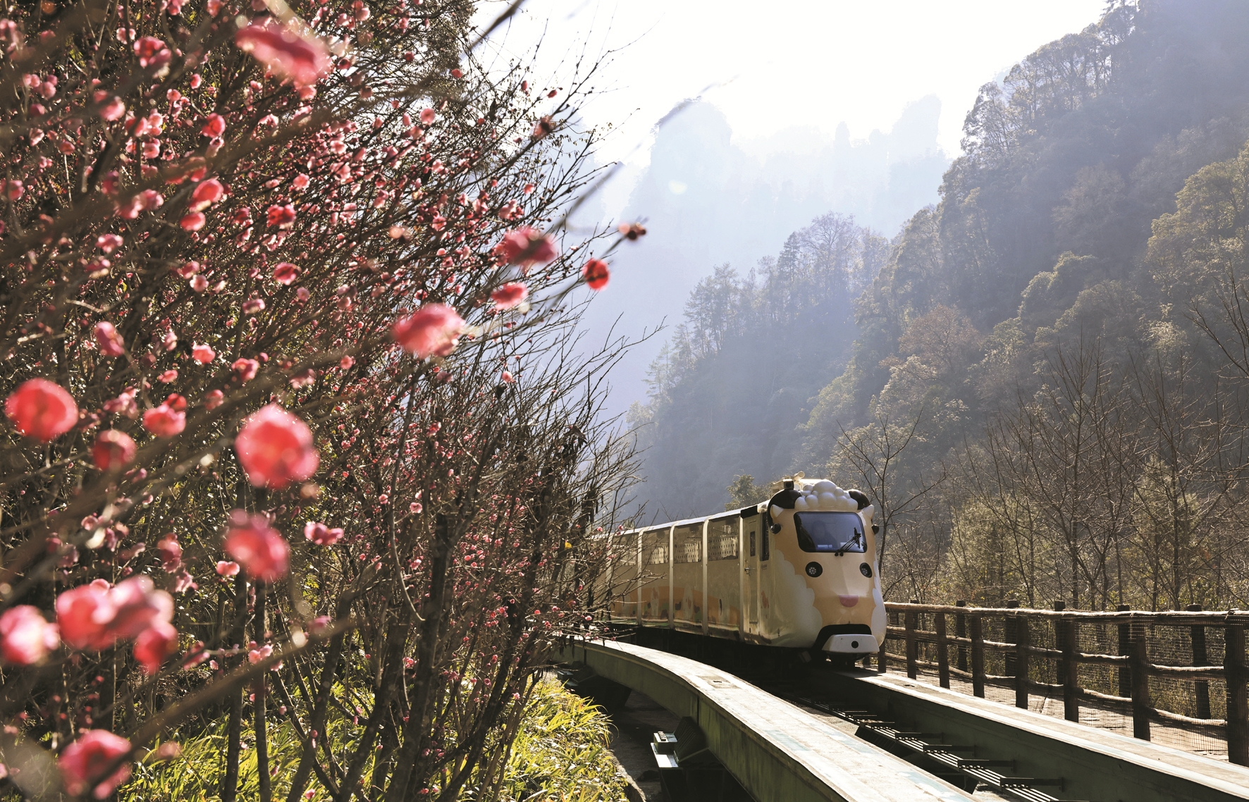 图?:1月11日,观光电车行驶在梅花盛开的湖南张家界国家森林公园。