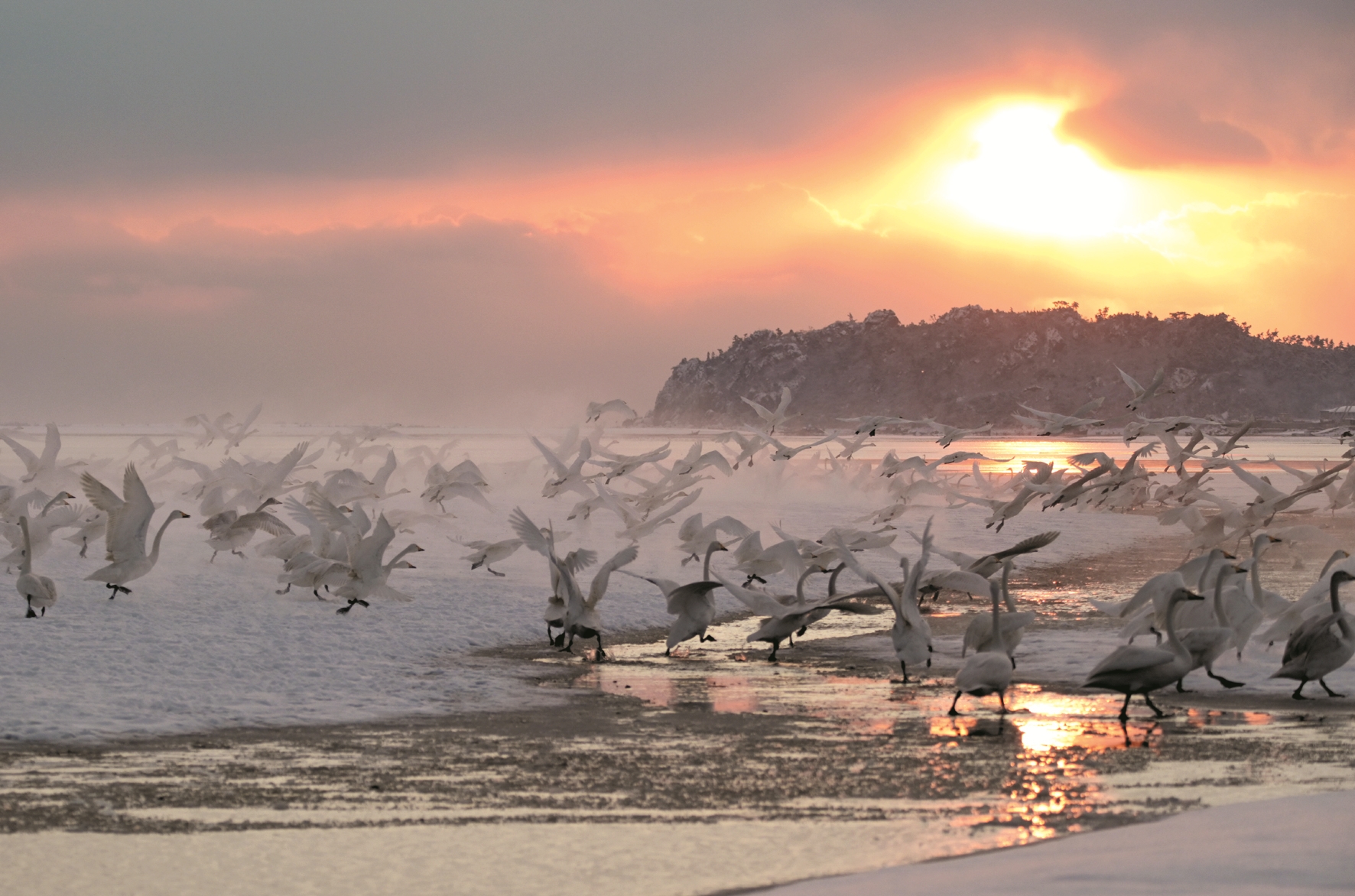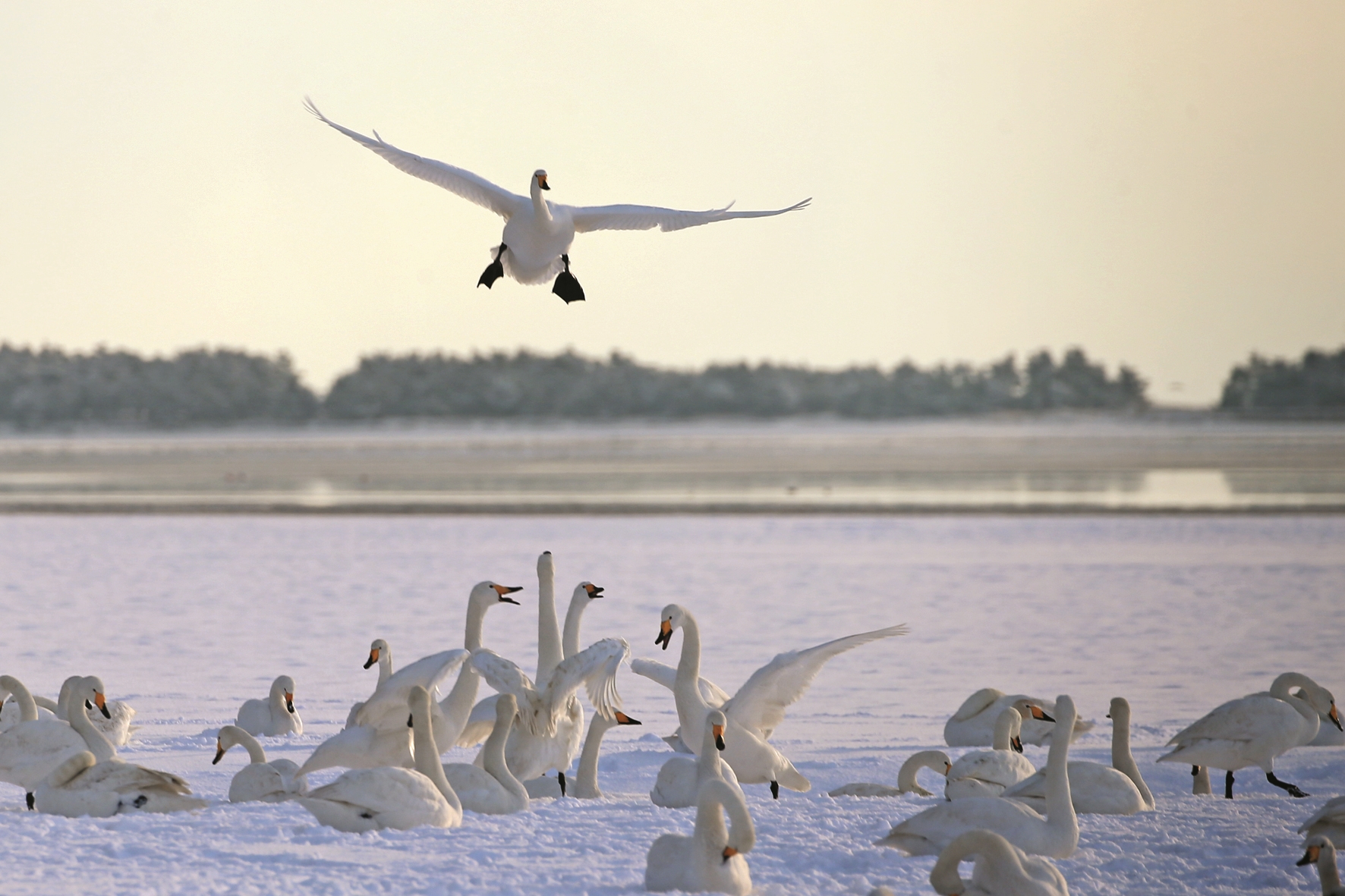 图?:1月11日在山东省荣成市大天鹅国家级自然保护区拍摄的大天鹅。