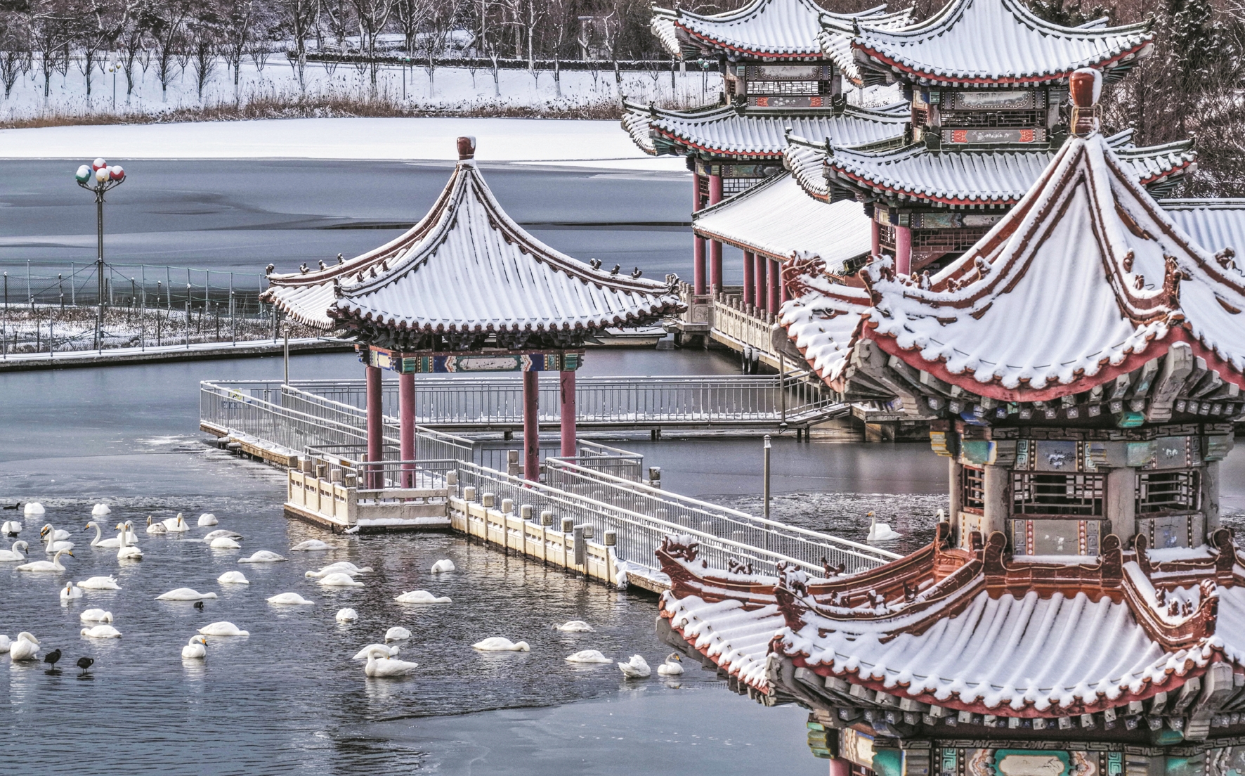 图?:1月11日,大天鹅在雪后的山东省荣成市成山镇西霞口隆霞湖公园栖息、游弋、觅食。