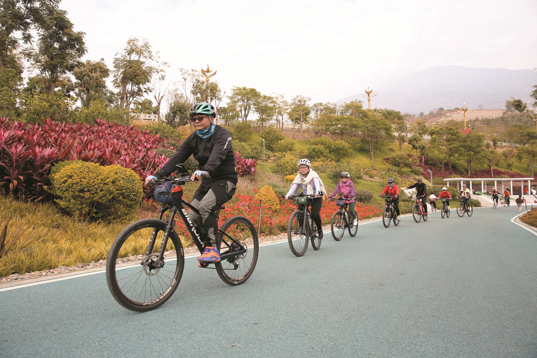图?:1月10日,骑行爱好者在云南省昭通市巧家县滨江休闲运动生态廊道生态绿湾骑行。