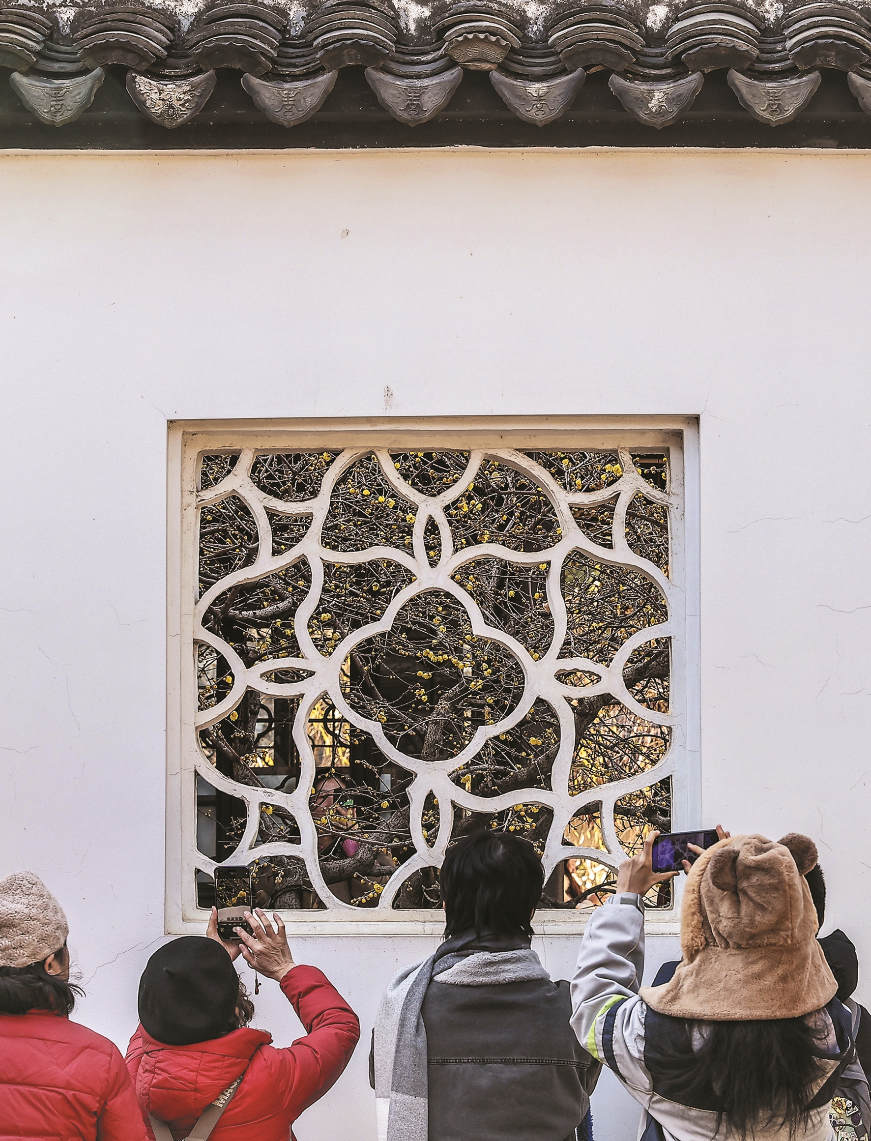 图?:1月11日,游人在梅花绽放的南京瞻园拍照。