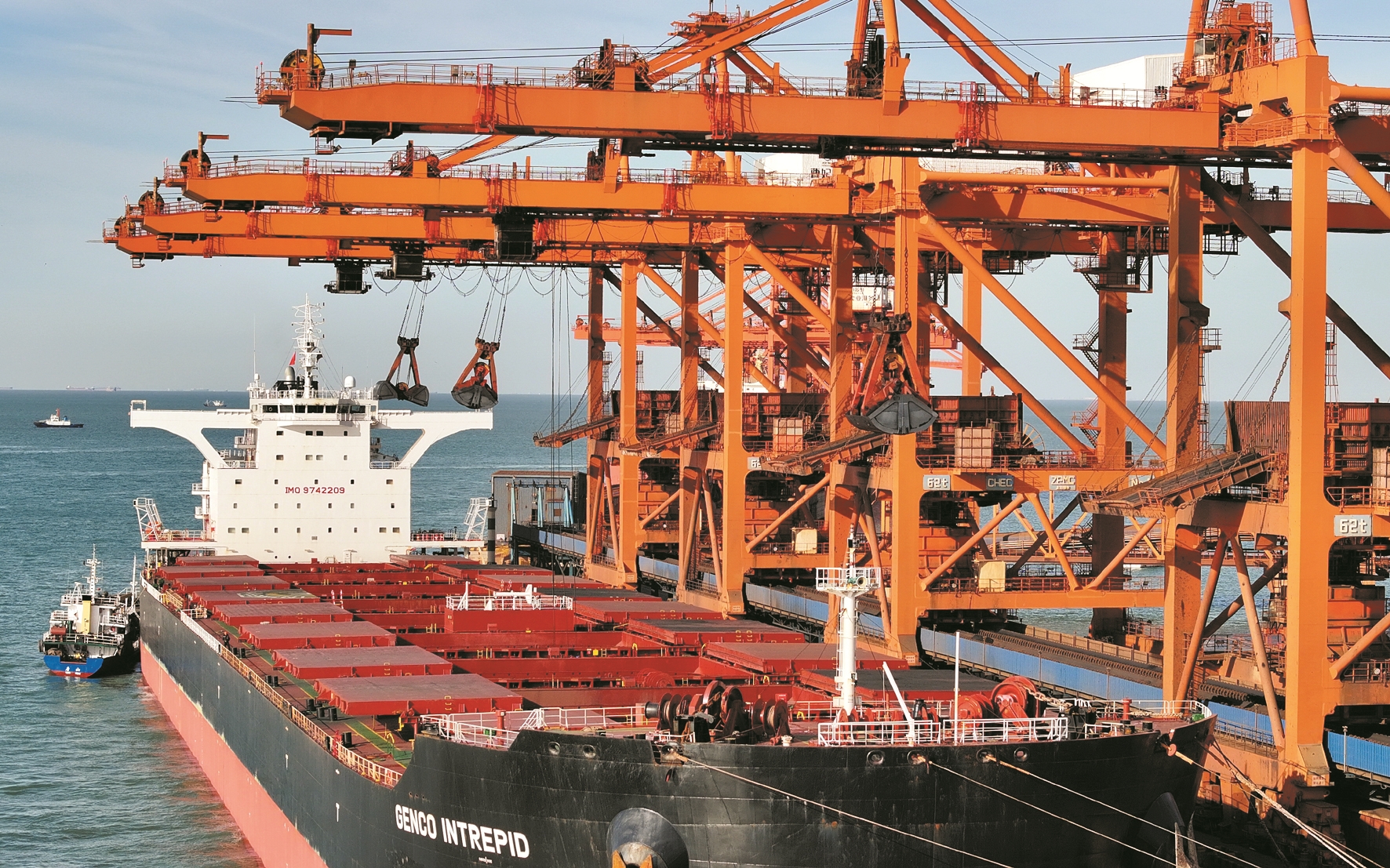图为靠泊在唐山港曹妃甸港区矿石码头的一艘轮船在卸载(无人机照片)。新华社记者 杨世尧摄