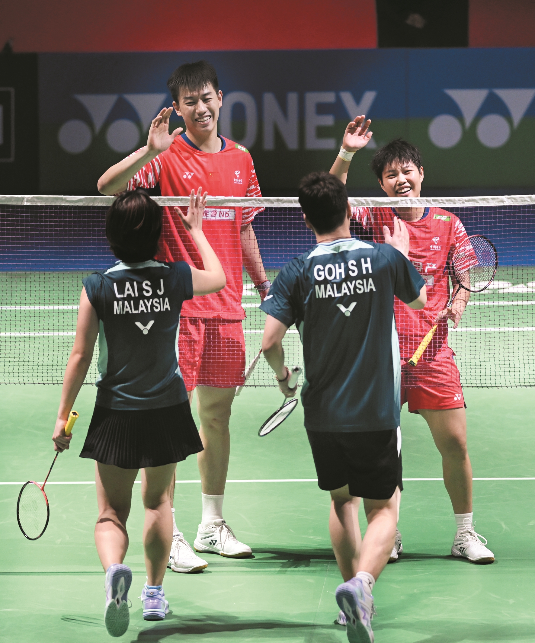 ?图为当日,冯彦哲(左二)/黄东萍(右一)与吴埙阀(右二)/赖洁敏在比赛后相互致意。