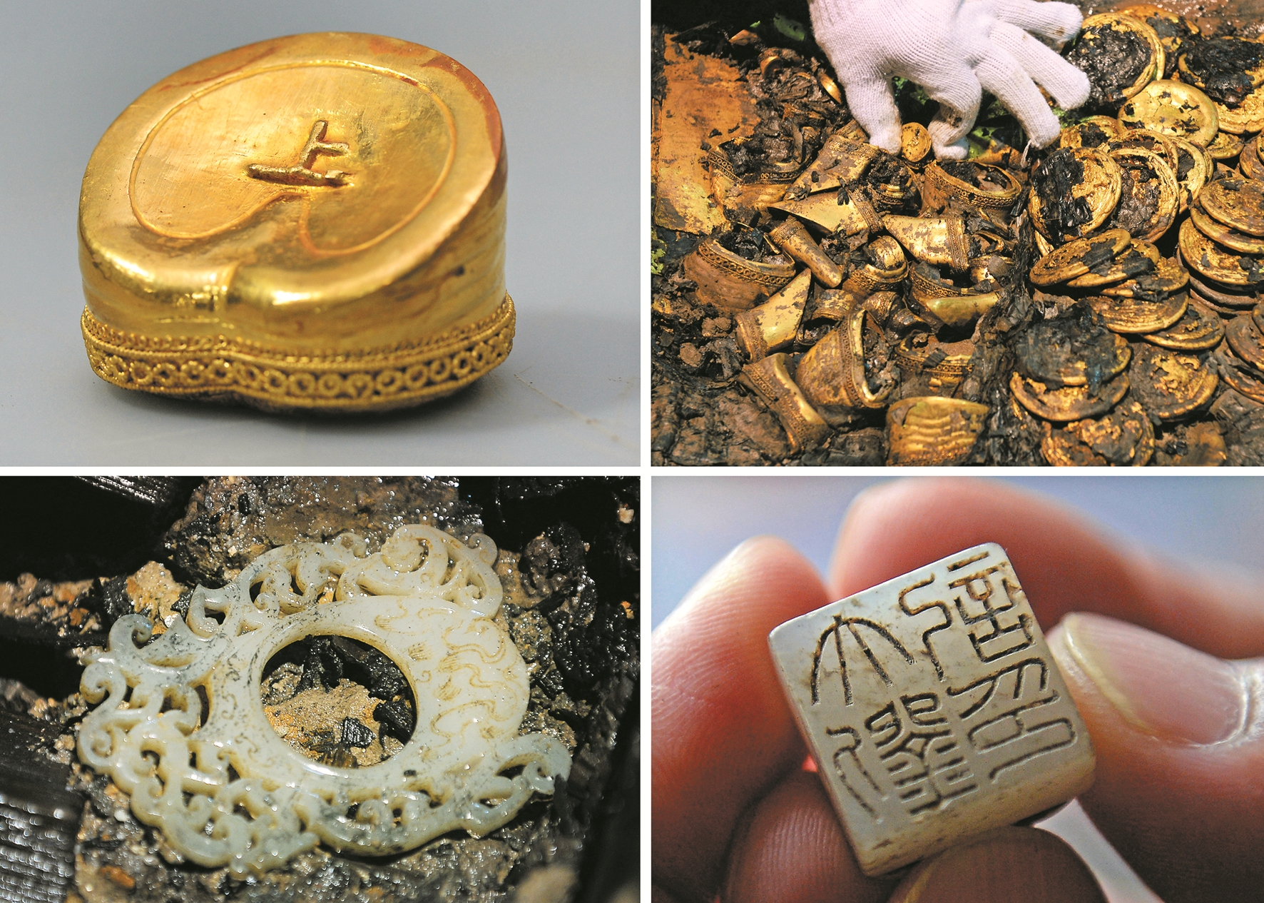 图?:这是一张拼版照片。左上图:海昏侯墓出土的马蹄金(2015年11月24日摄);右上图:海昏侯墓主棺出土的金饼、马蹄金、麟趾金和金板(2015年12月24日摄);左下图:海昏侯墓出土的玉佩(2015年11月18日摄);右下图:海昏侯墓出土的玉印(2015年12月13日摄)。