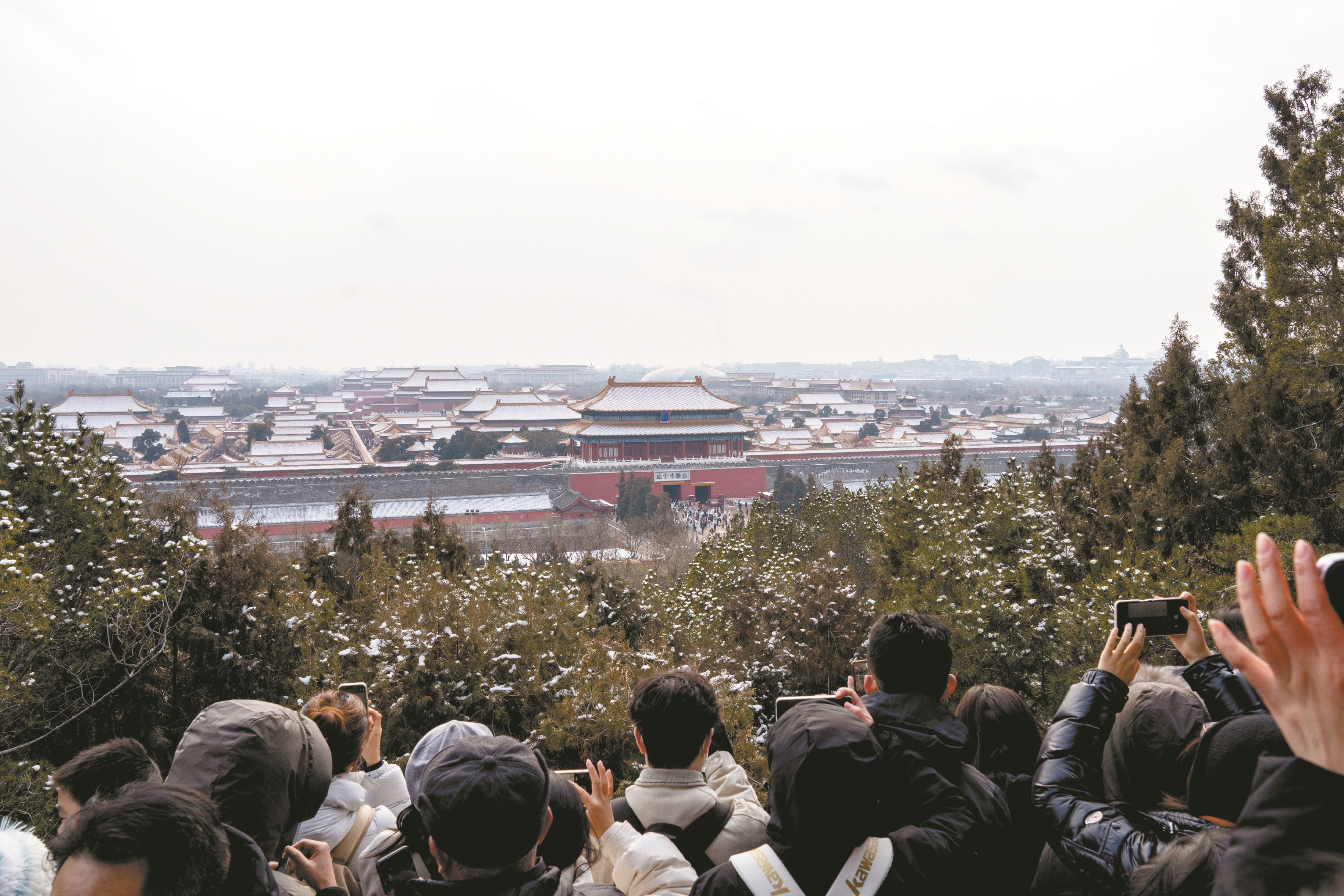 图①为人们在北京景山公园观赏、拍摄故宫雪景。