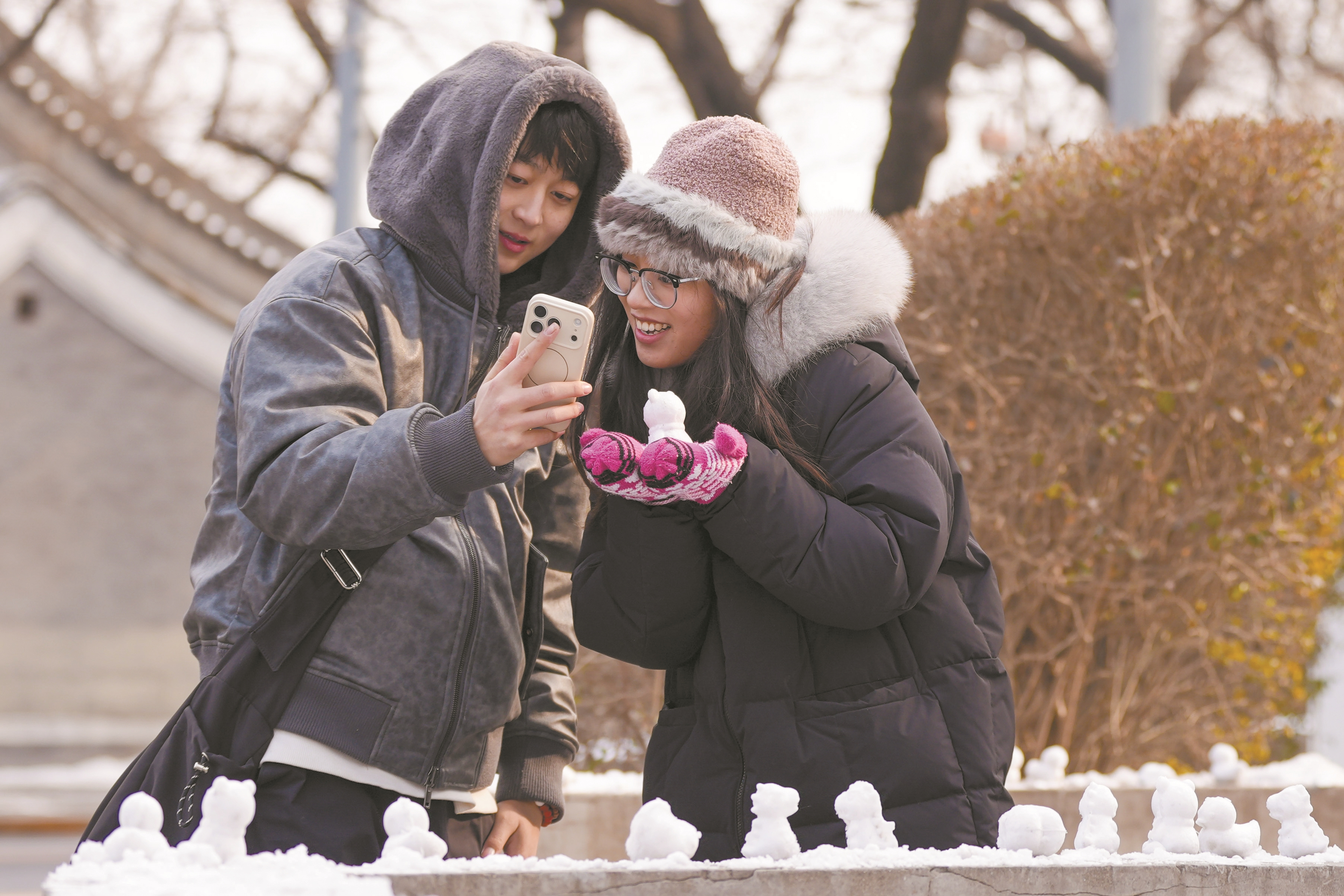 图④为人们在北京景山东街路边与“迷你”雪人合影。