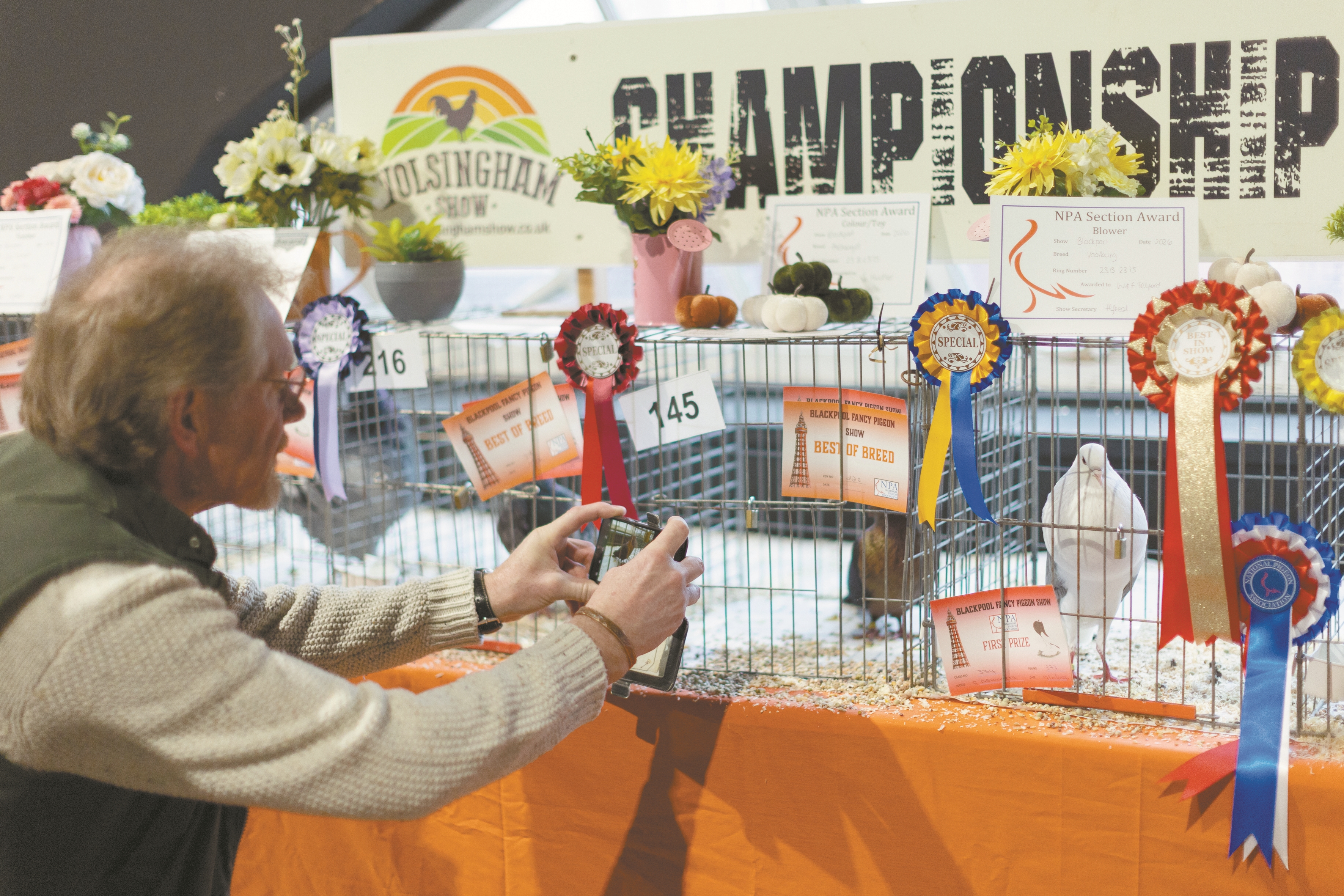 图为1月18日,在英国布莱克浦,一名参观者在2026英国国际信鸽展上拍摄获奖的观赏鸽。 (新华社发)