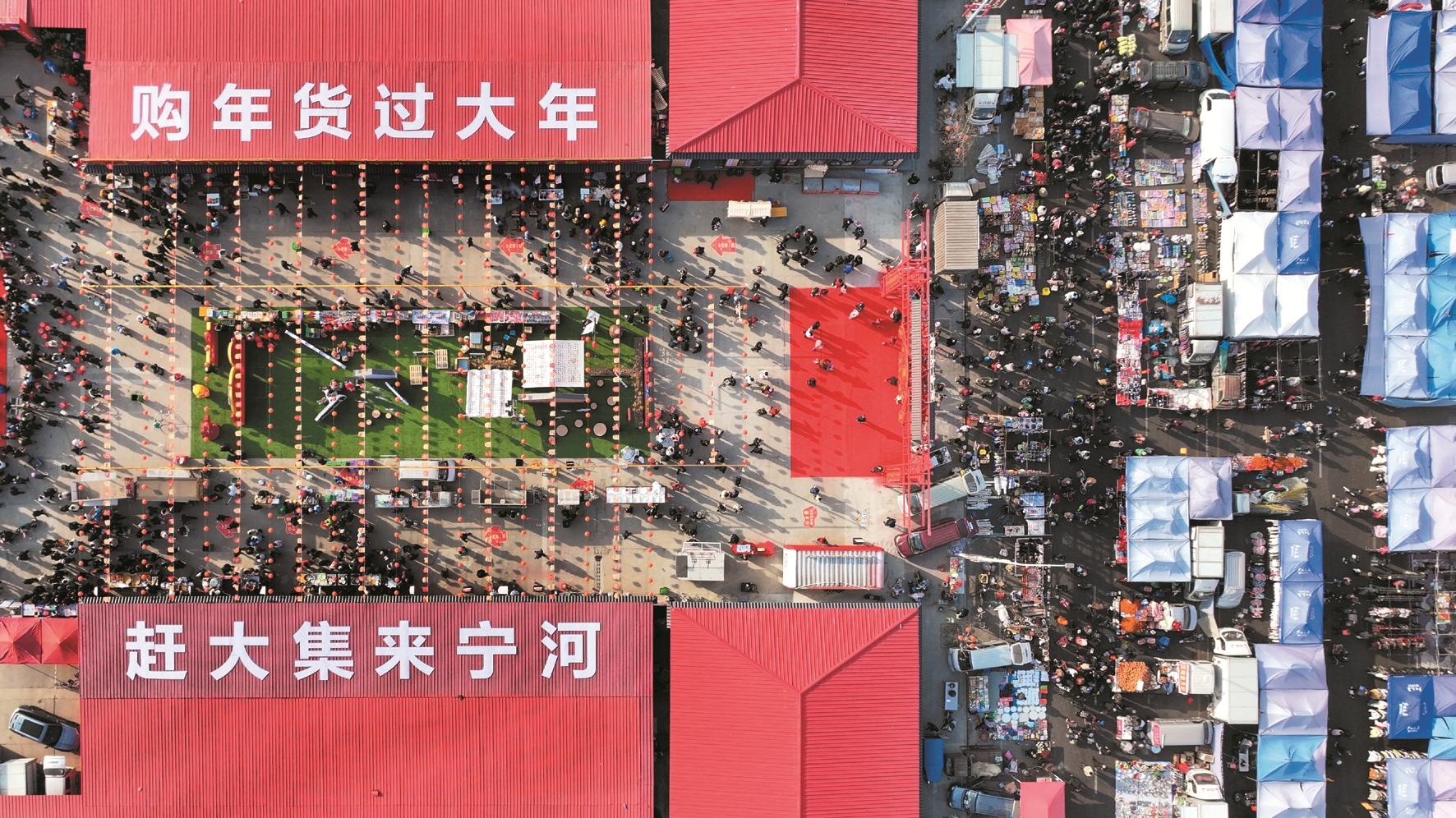 图①为当日拍摄的天津芦台大集(无人机照片)。