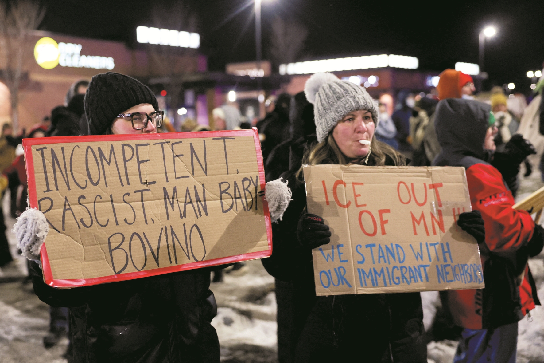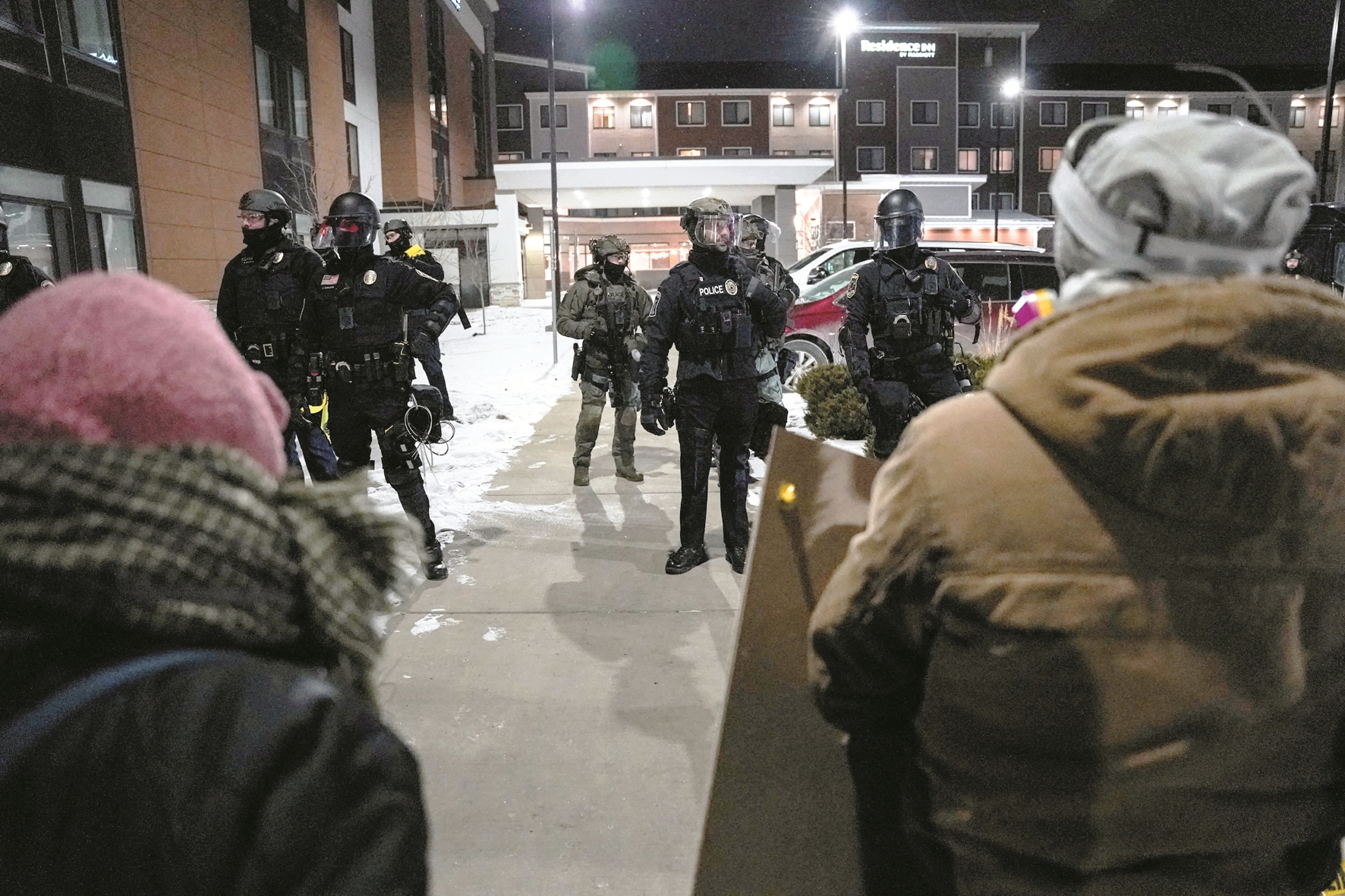 ▼图为当日,在美国明尼苏达州,抗议人群在据信为格雷戈里·博维诺所居住的酒店外与执法人员对峙。 (新华社发)