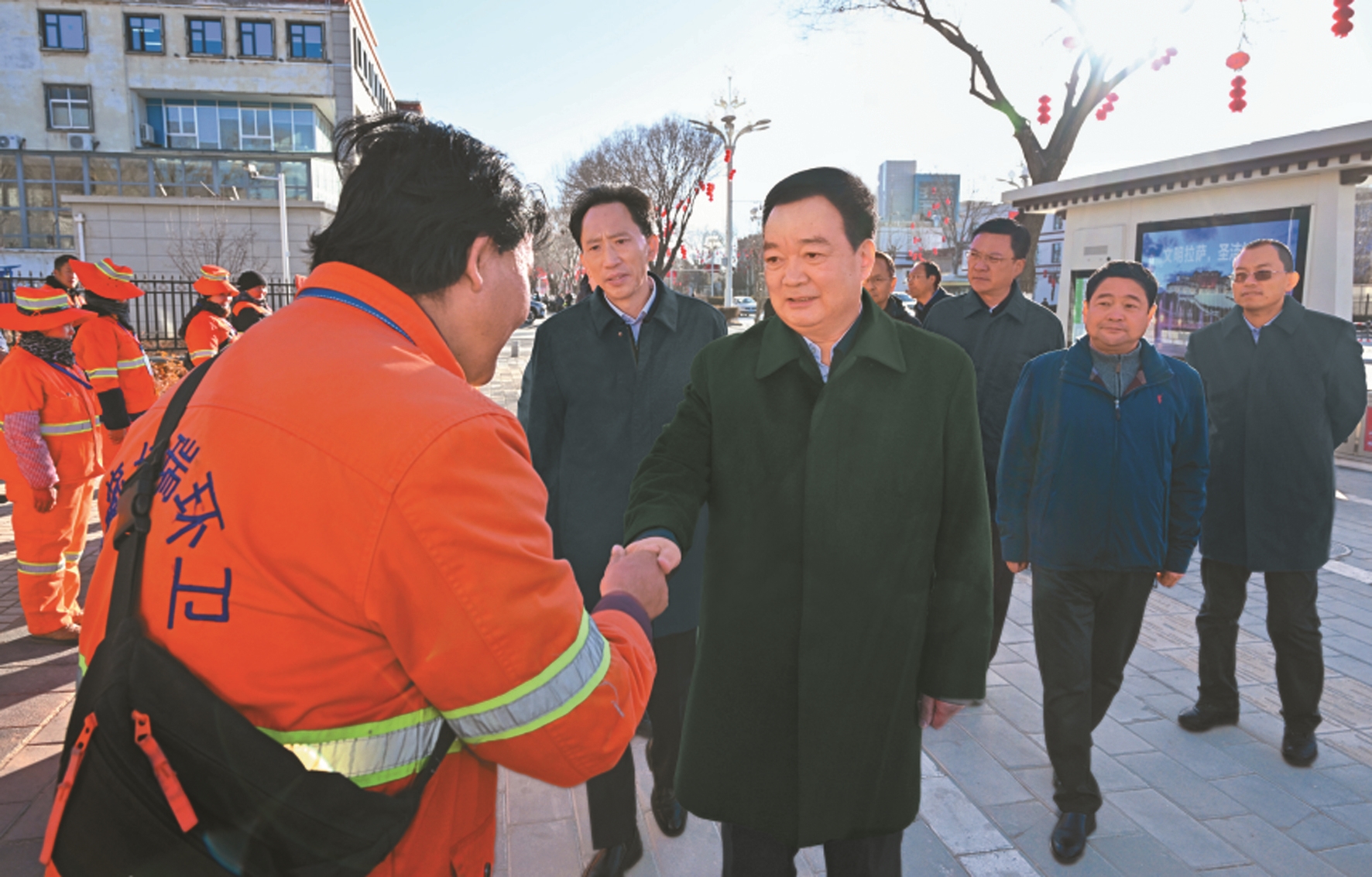 王君正来到拉萨市城关区金珠中路,看望慰问正在作业的环卫工人,感谢大家的默默付出,祝大家新年吉祥、身体健康。“今天的拉萨独具特色、美丽宜居,市民们以生活在这座城市而自豪。你们为城市建设作出了重要贡献,用勤劳双手把城市装扮得更加优美整洁,让市民生活得更加安逸舒适。”越是过节越是辛苦,王君正叮嘱有关部门要进一步关心关爱环卫工人,提升机械作业效率,科学设置休息驿站,做好防寒保暖和安全防护,在全社会营造尊重环卫、关爱环卫、支持环卫的良好氛围。