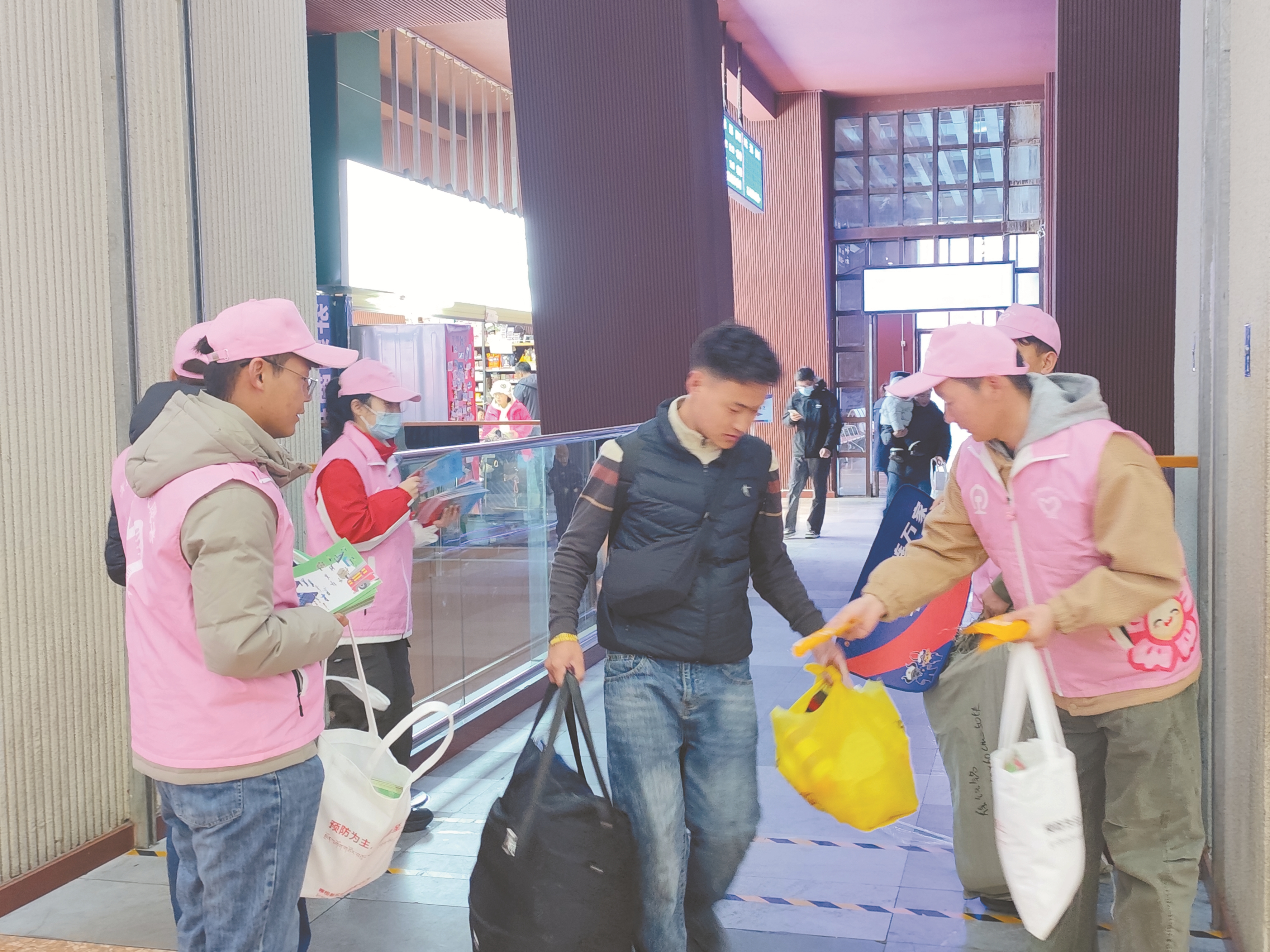 图为身着粉色马甲的志愿者向旅客发放毛巾等旅途用品。拉萨融媒记者 齐永昌摄
