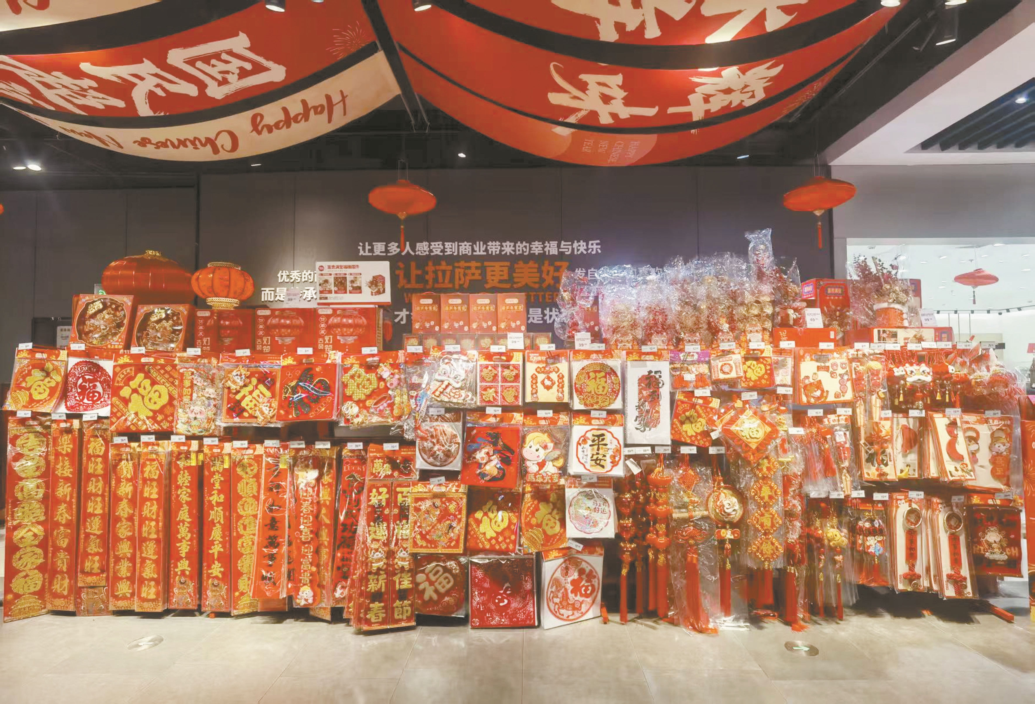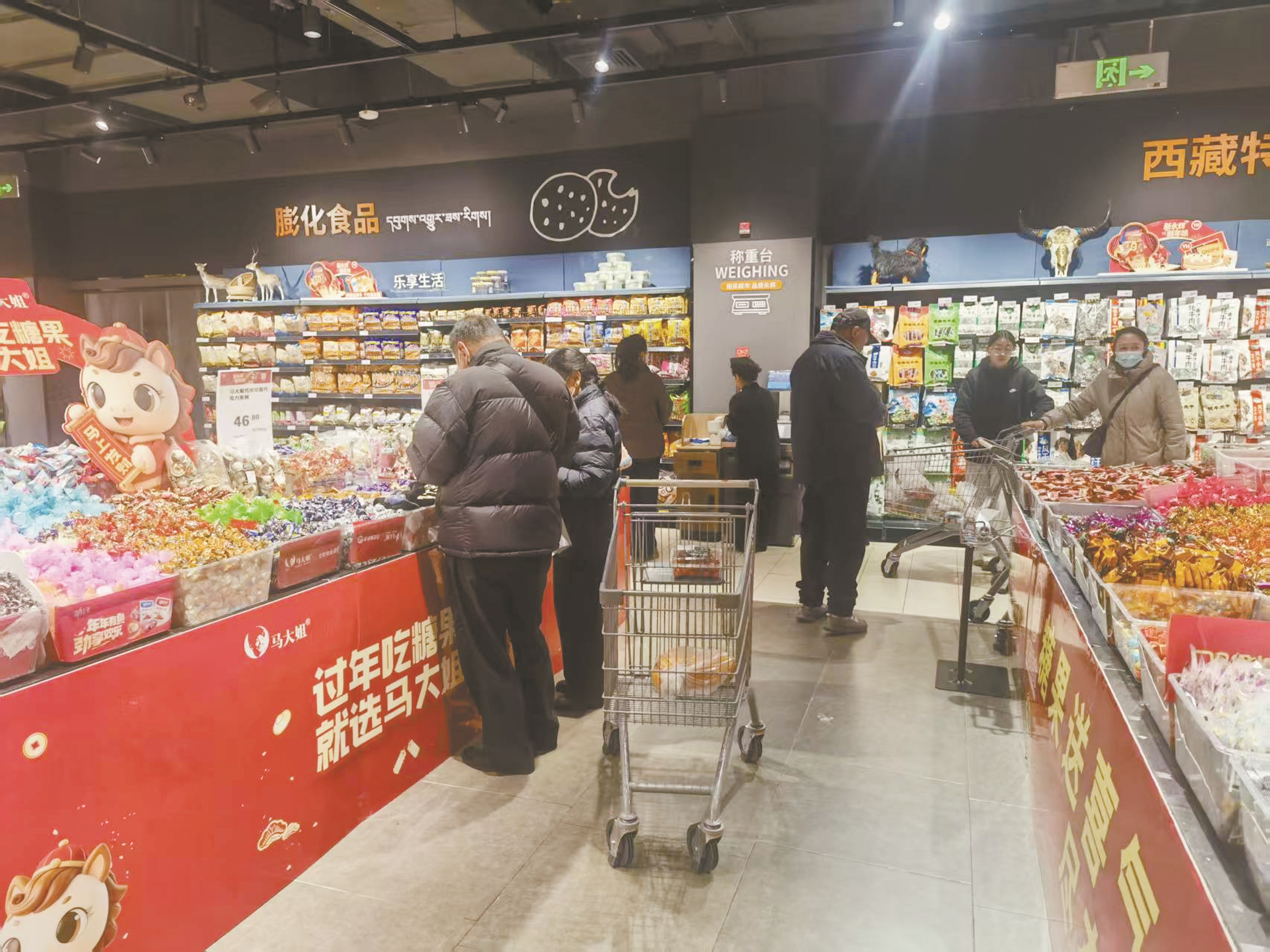 春节、藏历新年临近,年味变得“触手可及”。日前,记者实地走访发现,我市各大超市已变身“年货大街”:高悬的大红灯笼、醒目的“福”字墙与琳琅满目的节庆商品交相辉映。今年,各大超市着力打造沉浸式消费场景,通过主题陈列与文化展示,不仅满足采购需求,更让顾客在逛与选中,提前感受到浓郁祥和的节日氛围。