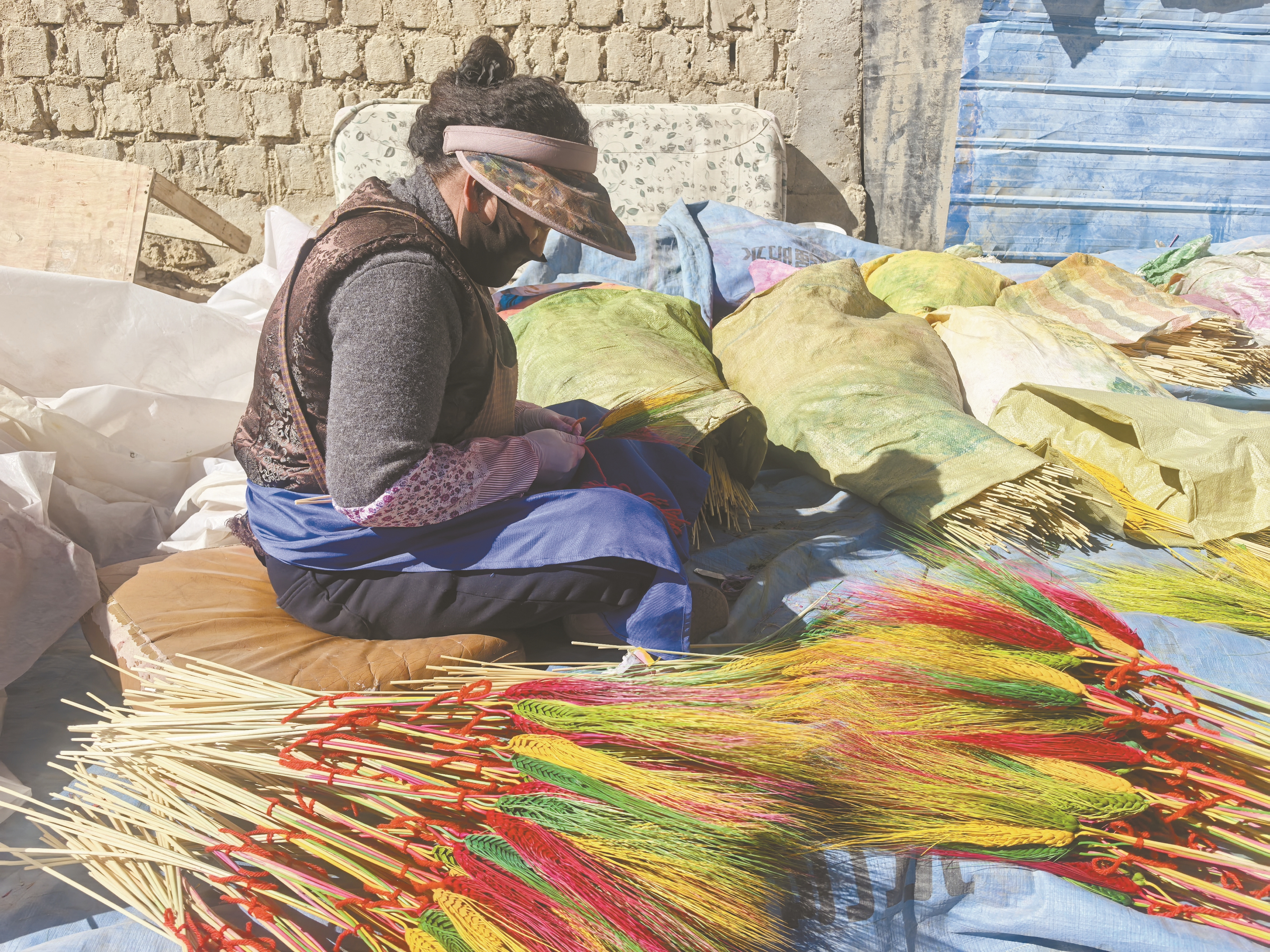 村口处,村民们分工协作:有人整理染好的穗子,剔除残缺的颗粒;有人搭配颜色,按比例组合四种色彩;有人照看晾晒在家门口的穗子;还有人专注捆扎,指尖的棉线仿佛有了生命,在穗间轻盈跳跃。举起刚捆好的一束“罗萨梅朵”,阳光透过穗隙在地上投下斑驳光影,与村民袖口沾染的颜料色块相映成趣。