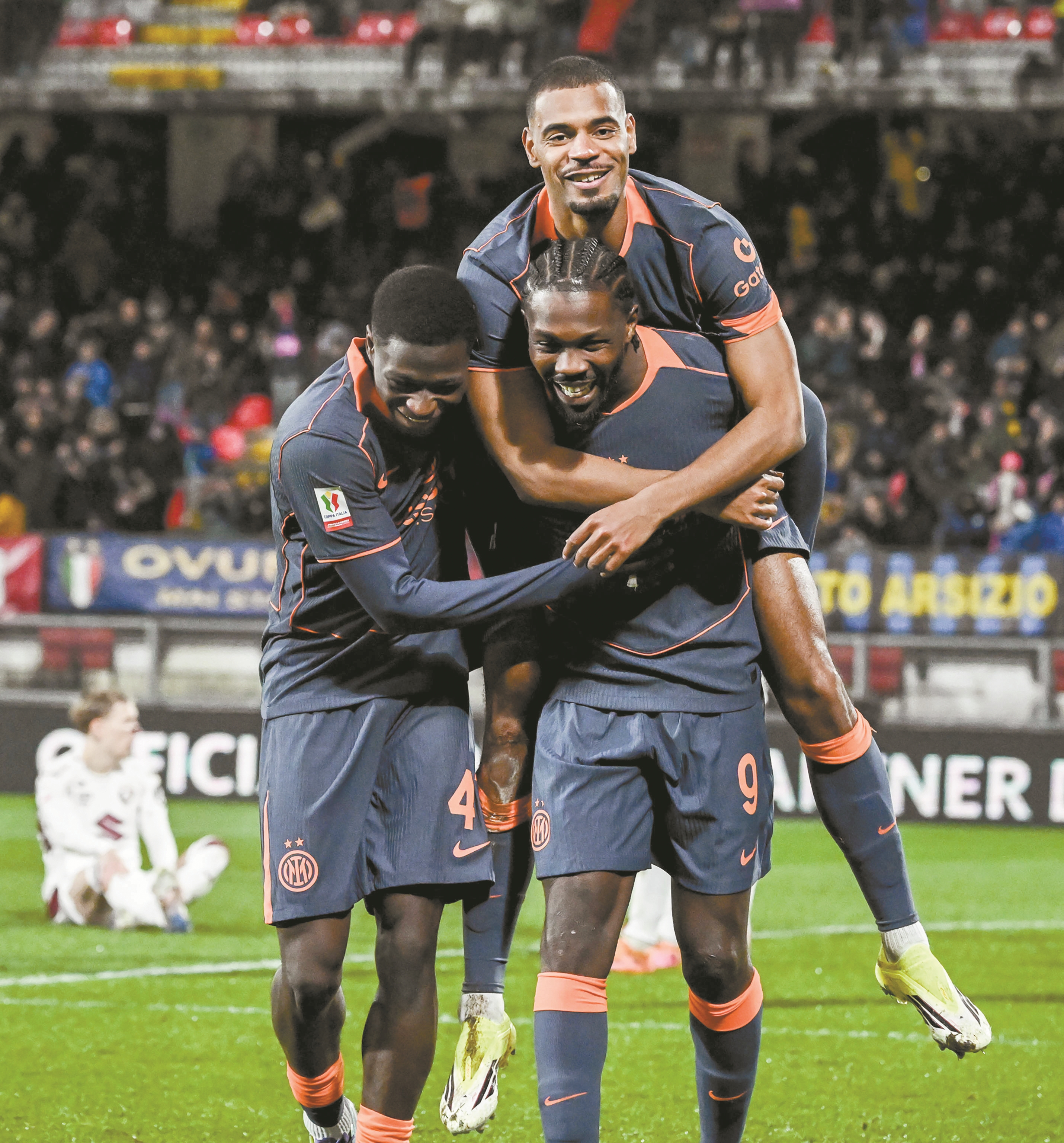 这是2月4日,国际米兰队球员迪乌夫(上)攻入球队第二球后与队友卡马特(左)、图拉姆庆祝。