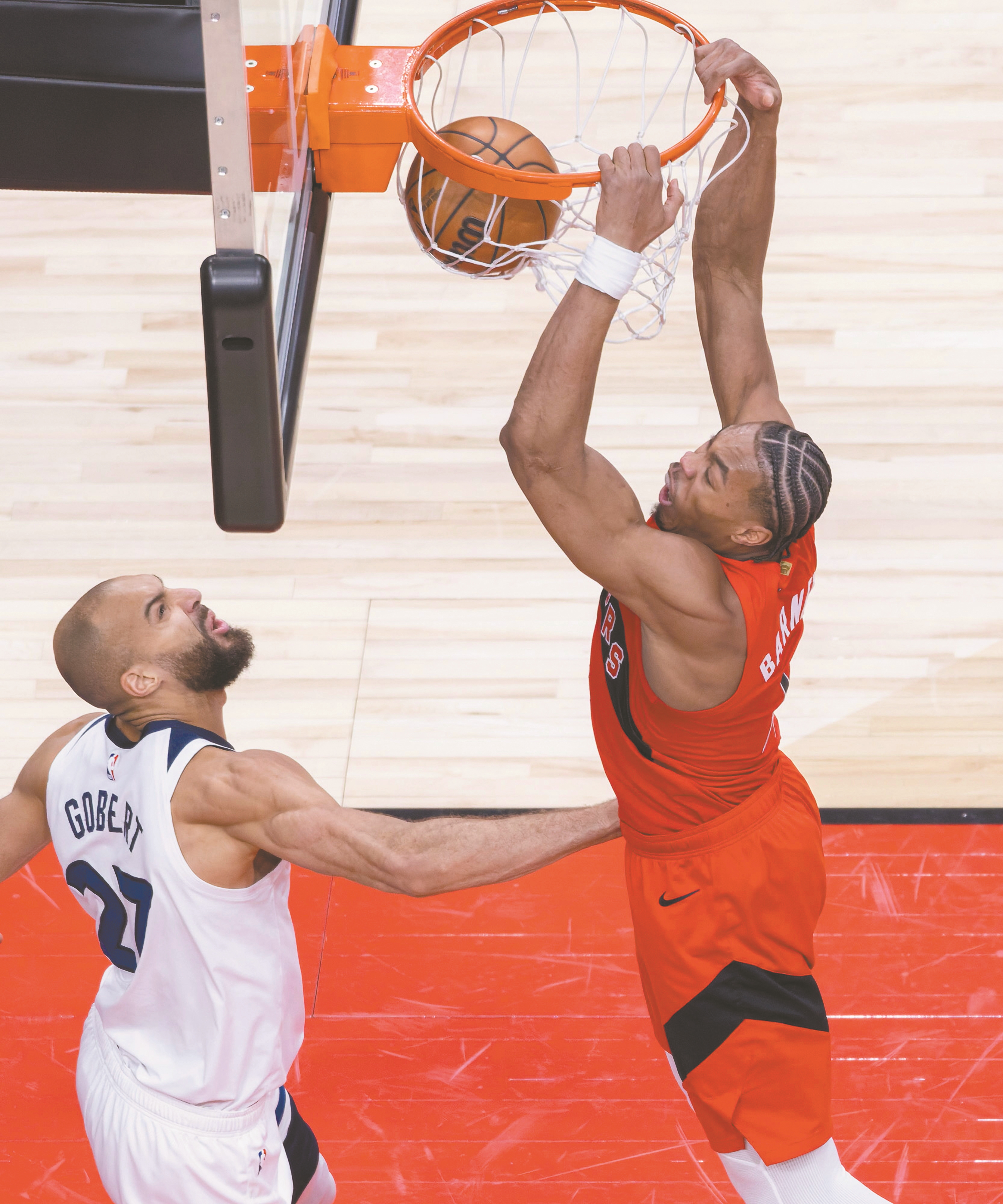 这是2月4日,猛龙队球员巴恩斯(右)在比赛中扣篮。