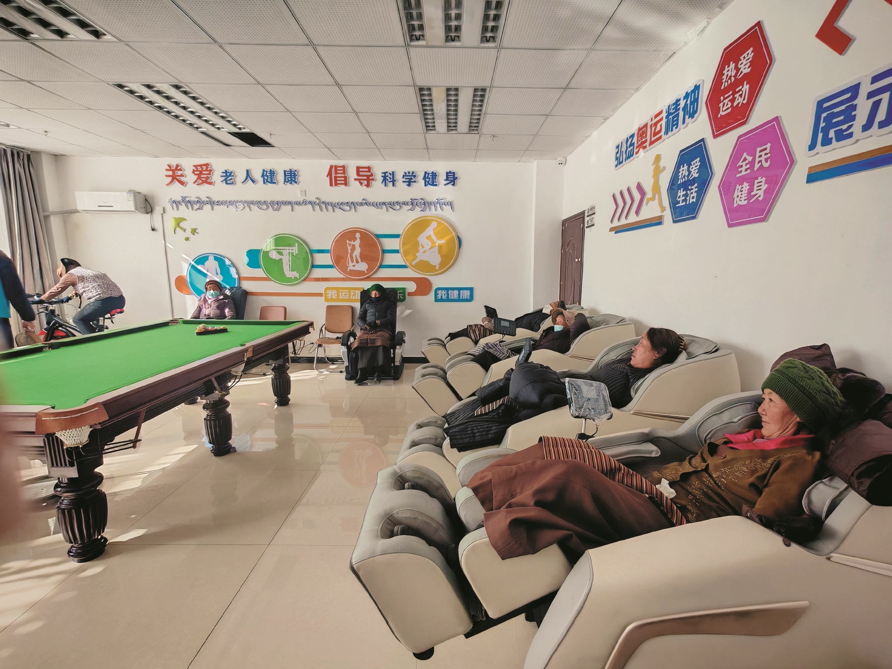走进拉萨高新区(柳梧新区)老年人日间照料中心活动室内,按摩椅一字排开,老人们正享受着按摩带来的放松;一旁的棋牌区,藏式克朗球的碰撞声和爽朗的笑声交织在一起,老人们围坐桌边,专注于牌局的同时,不时聊聊家常、有说有笑。