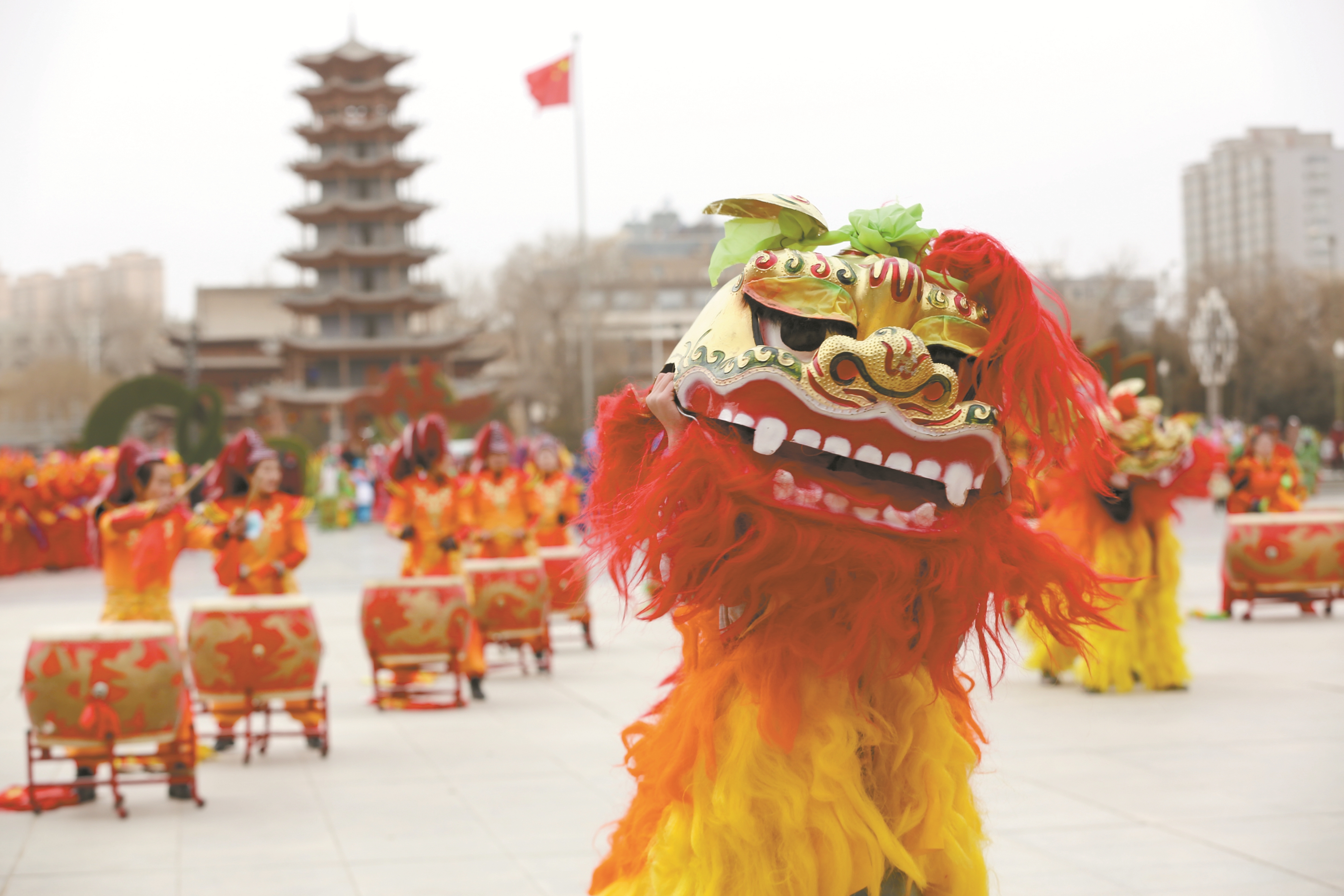 图为2月5日,非遗社火队在甘肃省张掖市甘州区中心广场进行舞狮表演排练。(新华社发)
